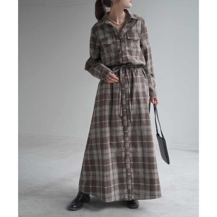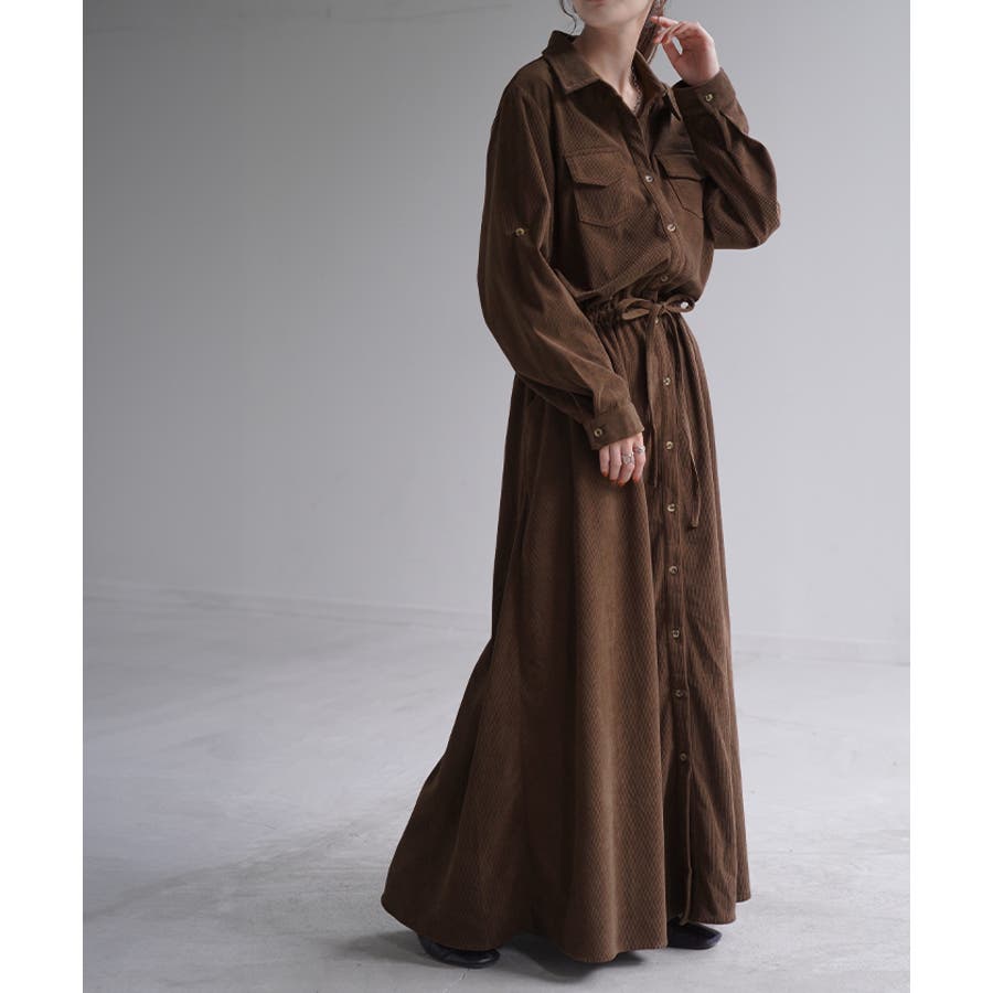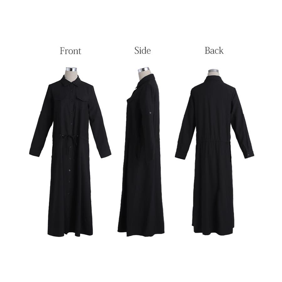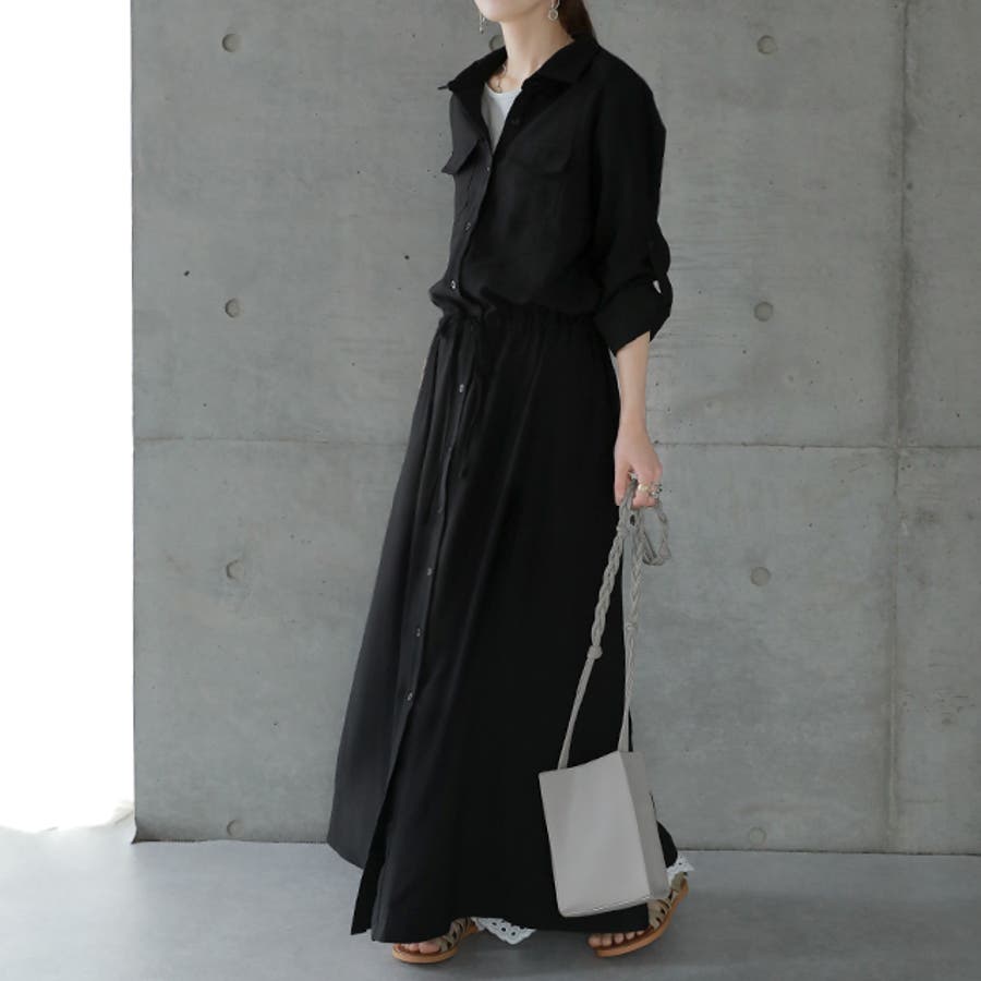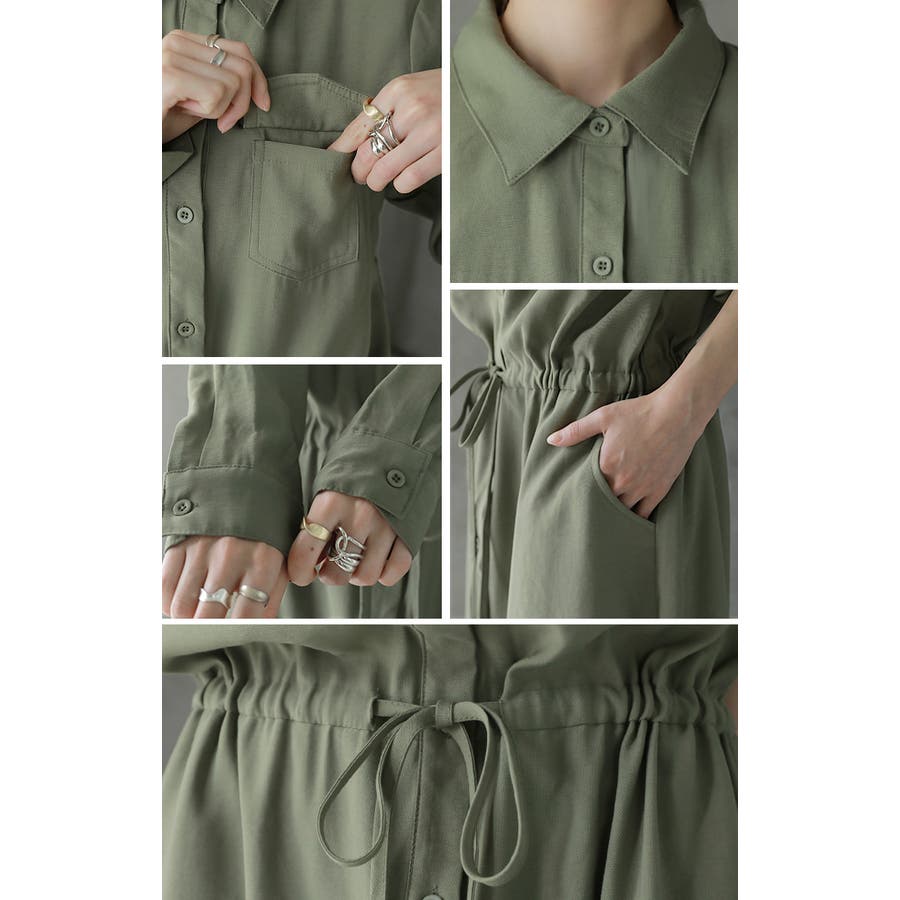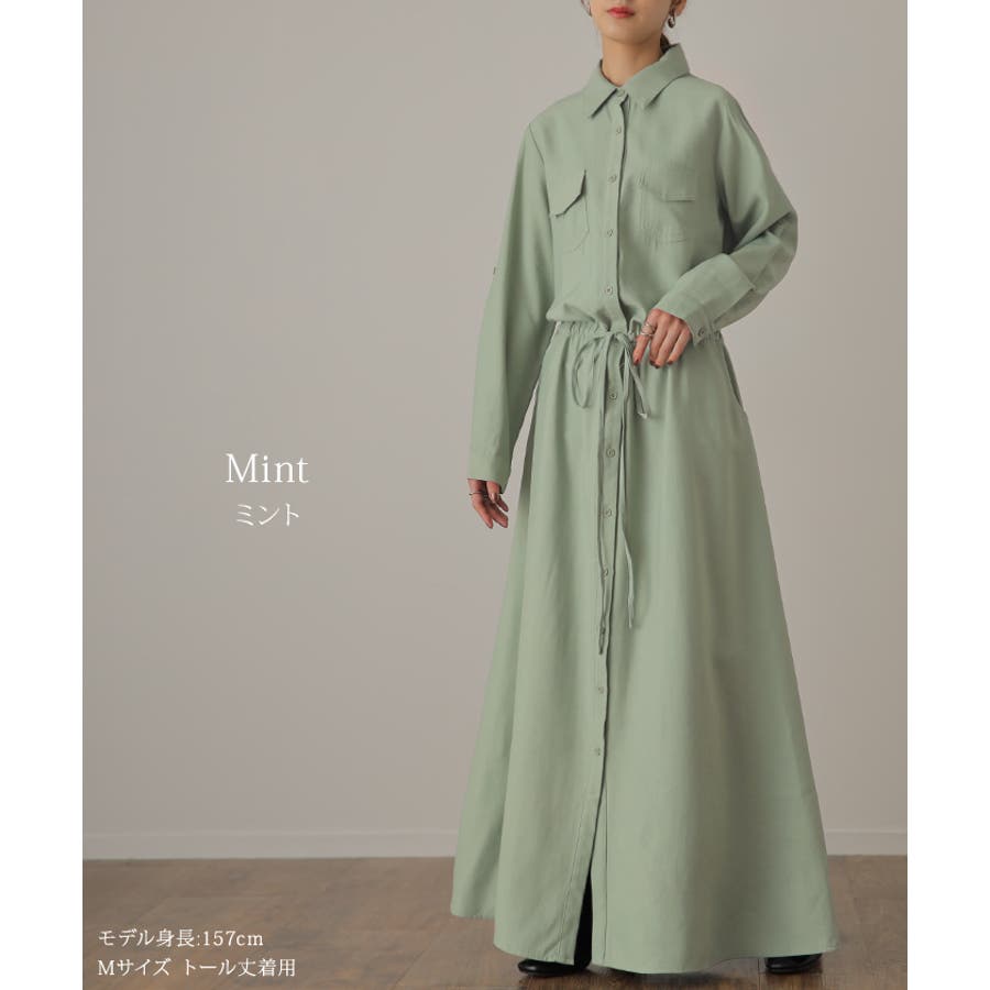 胸もとにフラップポケットをあしらったサファリテイストのロングシャツワンピース。