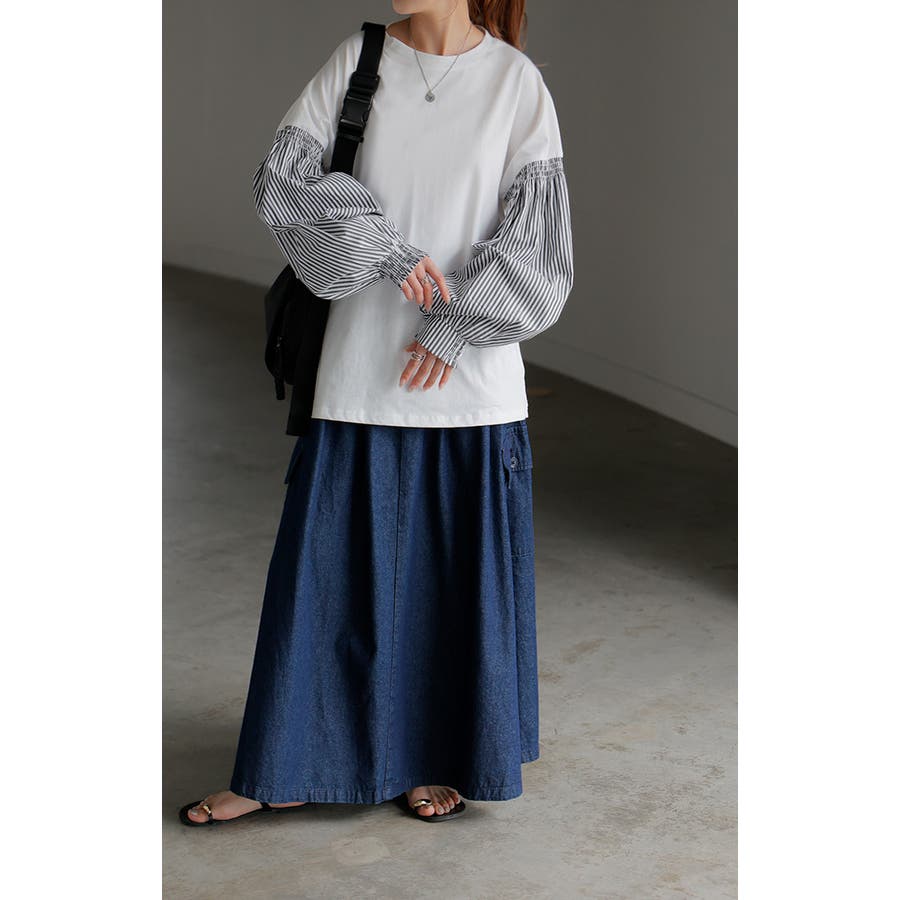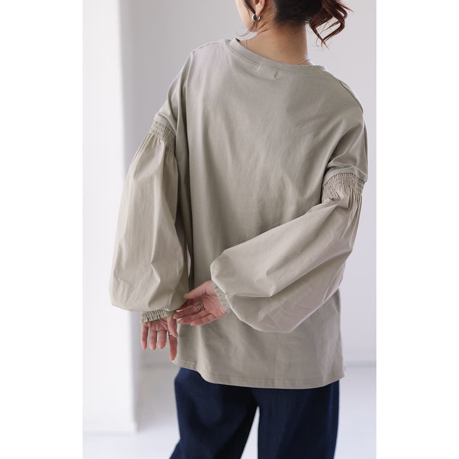 前身ごろと後ろ身ごろはTシャツ生地。袖は二の腕から下はポリエステルが入ったシャツ生地でふんわりとした形になっています。首周りは下着がチラ見えしない空き具合。袖口は半分だけ細いゴム4本でシャーリング。しょっちゅう腕まくりするとゴムが伸びそうですが、袖口がきゅっとした形なので全体のシルエットには影響ないかも。
