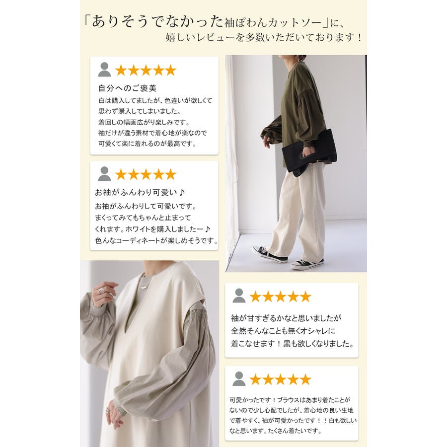 - ぽわん袖投稿日:2025.02.21さん (40代 / 女性 / 身長155~160cm / 体重60~64kg)購入アイテム:カラー ホワイトいつものトップスサイズ:Lサイズ感:ぴったり