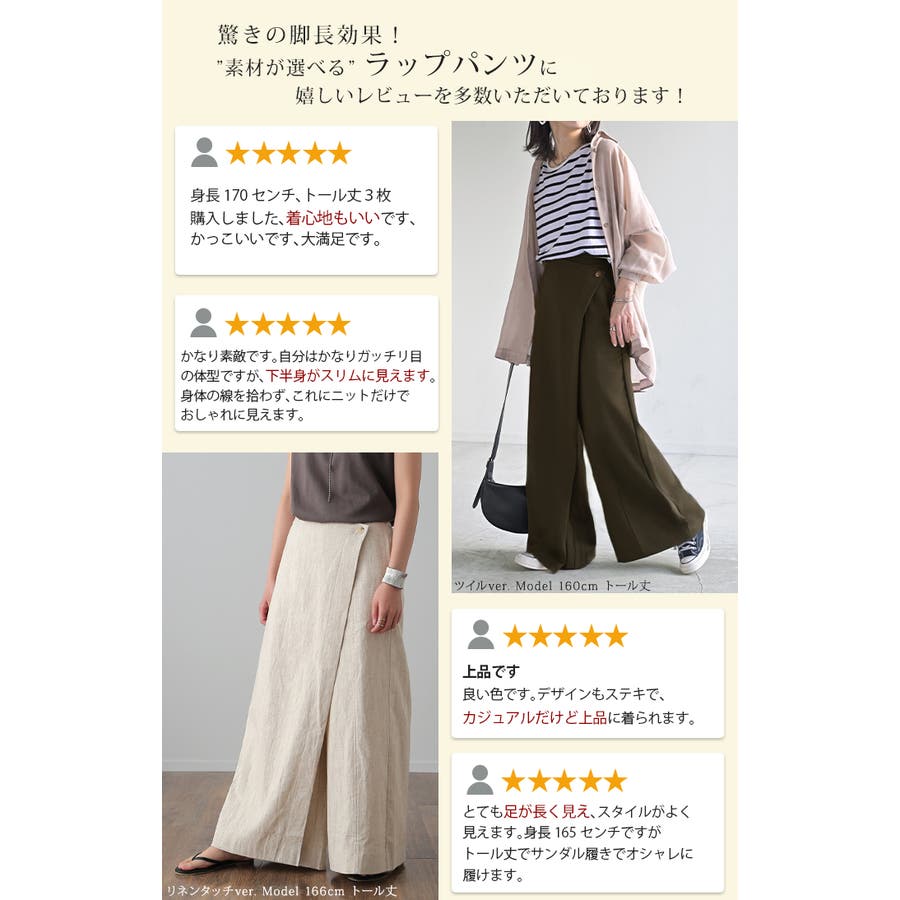 厚底サンダルを履くとちょうど良い感じです。さん (50代以上 / 女性 / 身長155~160cm / 体重50~54kg)購入アイテム:カラー アッシュオリーブ(トール丈)いつものボトムスサイズ:Lサイズ感:ぴったり - 脚長に