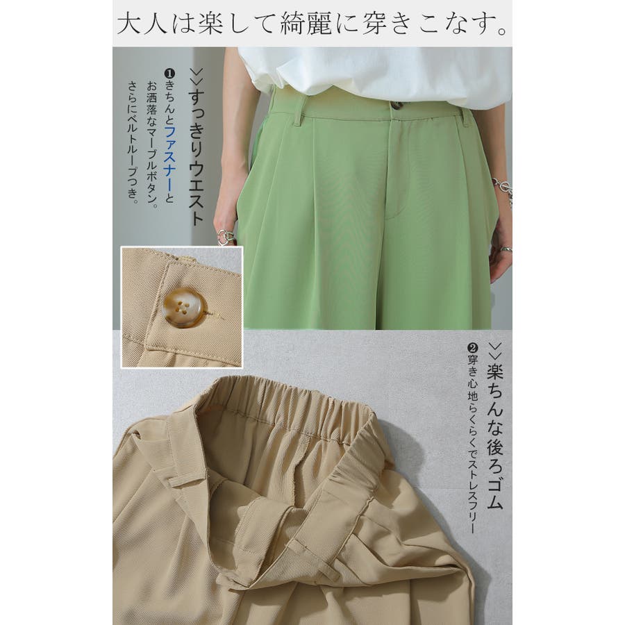 ウエストタックのきれいな縦落ちシルエットで女性らしい腰回りを演出します。