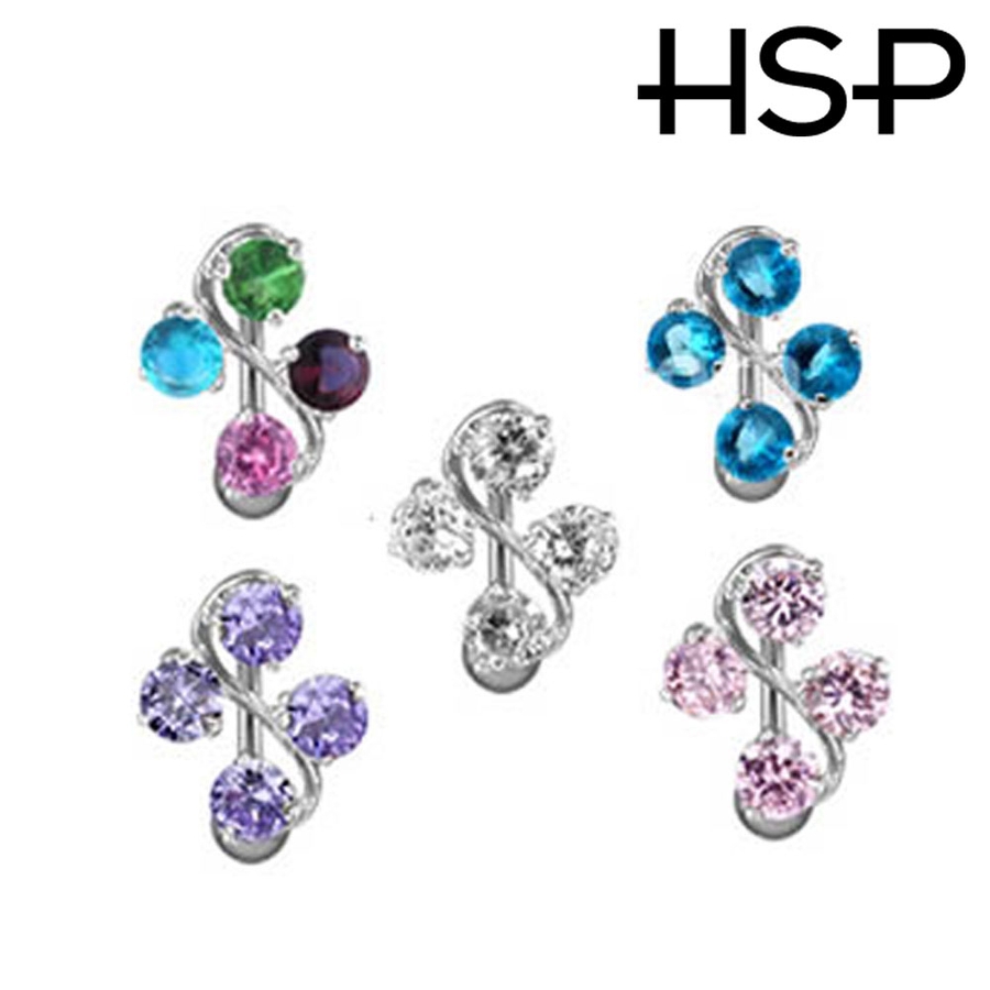 4つのジュエルがキラキラと輝くバインモチーフのヘソピアス(バナナバーベル)。