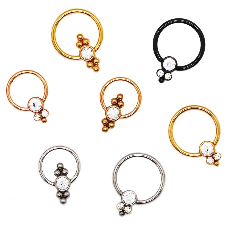 CZフラットクラスターボール 3ジュエル&ジュエルサイドボール キャプティブビーズリング 16G 18G