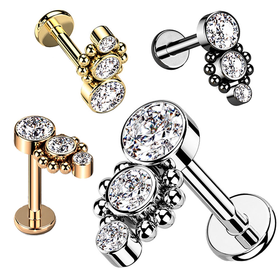 トリプルジュエル CZ ラウンド ドロップダウン ボールクラスター インターナル ラブレットスタッド 16G