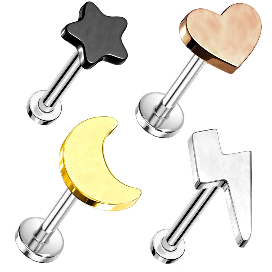 人気のグラフィックモチーフがオシャレな軟骨ピアス。ハート、ムーン(月)、スター(星)、ボルト(雷)の4種類をご用意。ミニサイズなのでヘリックスやトラガスにはもちろん、長めの軸長を選んでイヤーロブに着けるのもおすすめです。着脱の簡単なプッシュ式なのでネジの取り付けが苦手な方にも◎