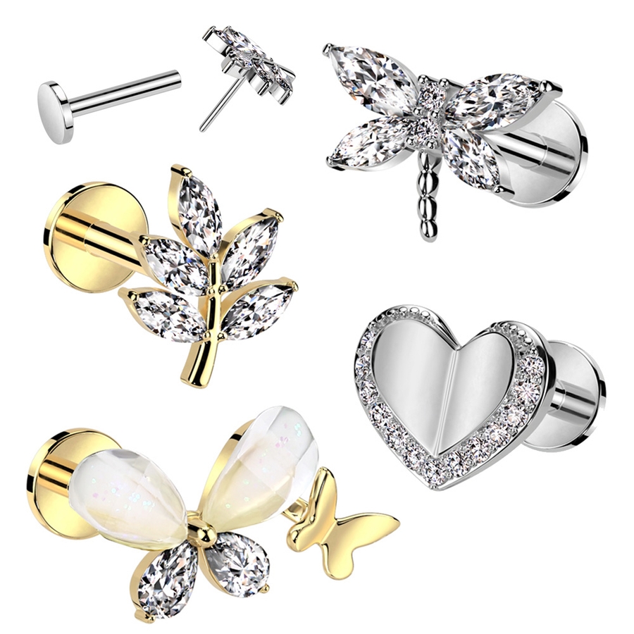 小さなモチーフがオシャレでかわいい軟骨ピアス。定番人気のハート、蝶々、ちょっぴり個性的な葉っぱとトンボの4種類。