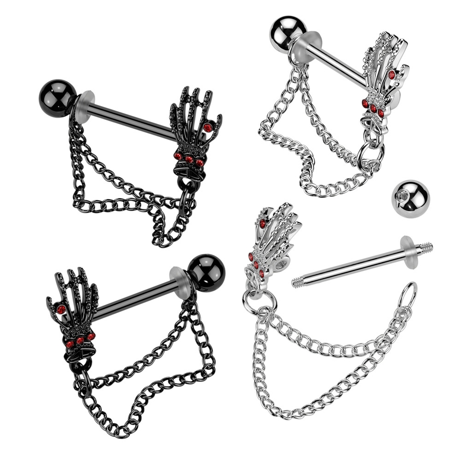 ニップル ピアス レッドジュエル スカルハンド ダブルチェーン ストレートバーベル 14G 1ペア