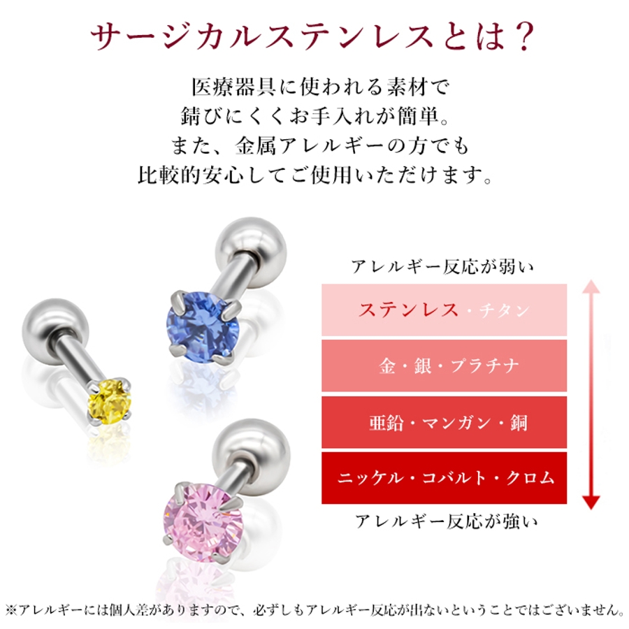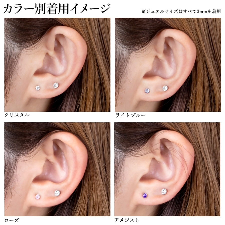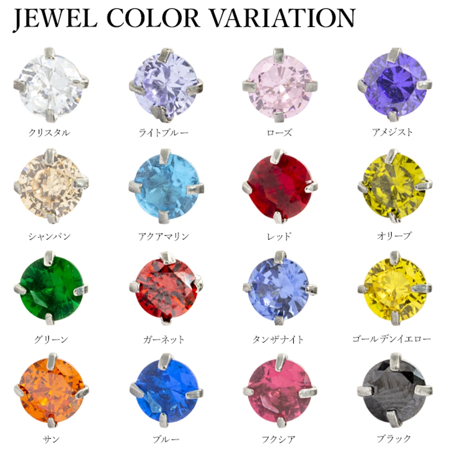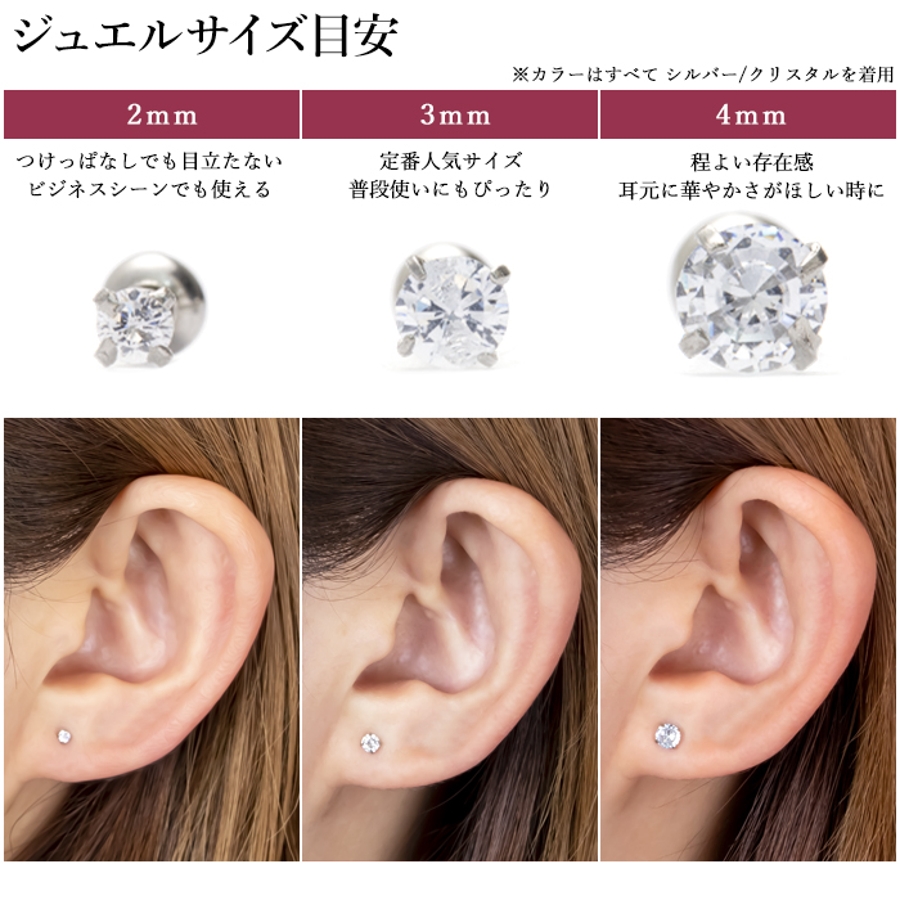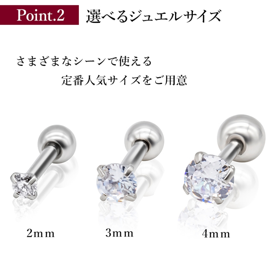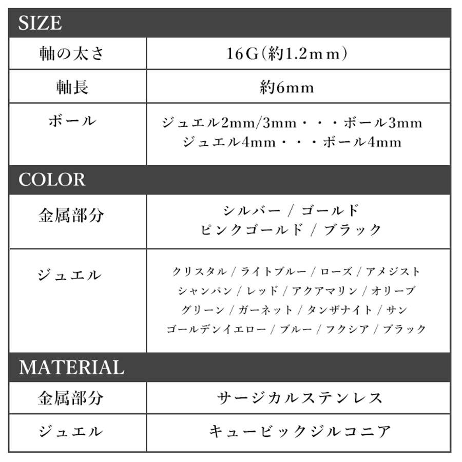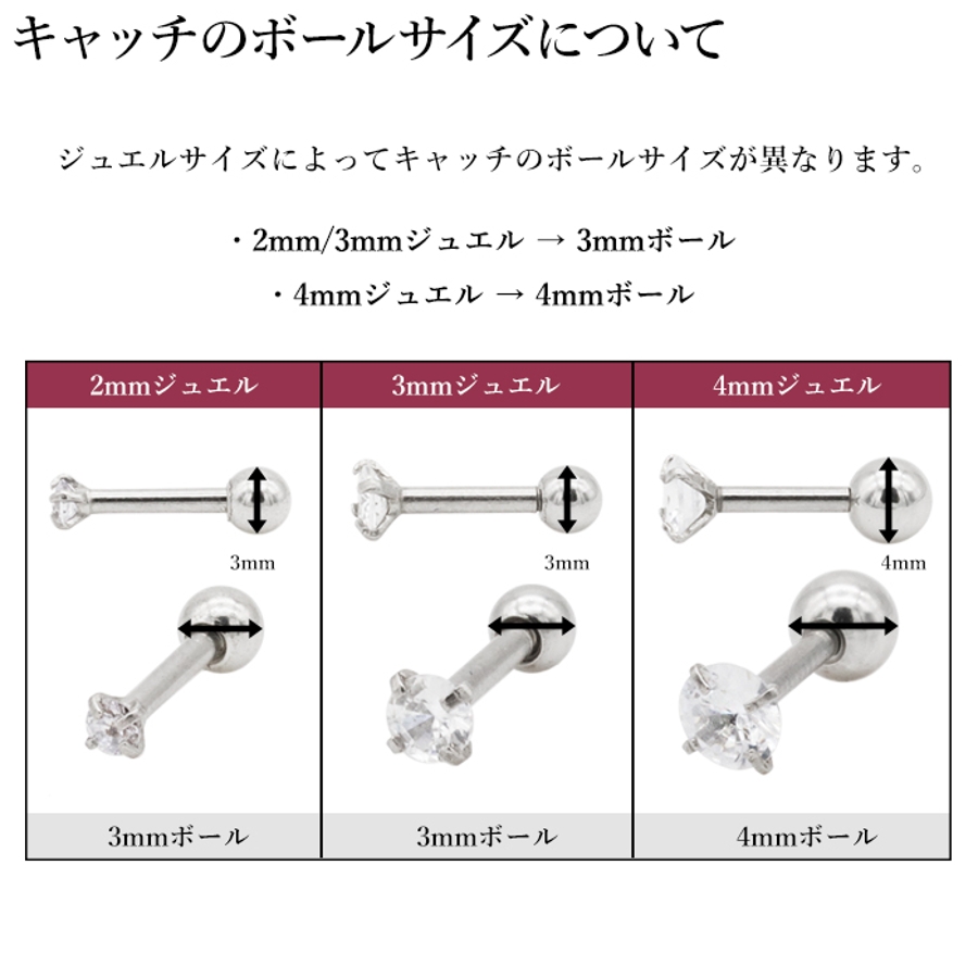 | ジュエルサイズ/軸カラー | 2mm/シルバー / 3mm/シルバー / 4mm/シルバー / 2mm/ブラック / 3mm/ブラック / 4mm/ブラック / 2mm/ゴールド / 3mm/ゴールド / 4mm/ゴールド / 2mm/ピンクゴールド / 3mm/ピンクゴールド / 4mm/ピンクゴールド |