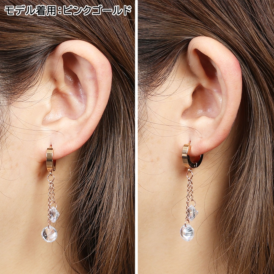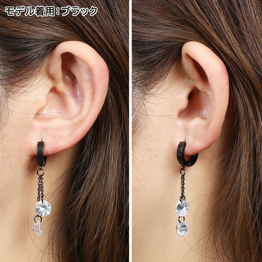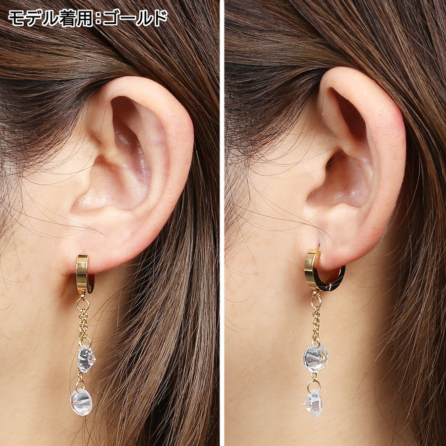 ダブル ダングリング CZ ジュエル チェーン ステンレスフープピアス 1ペア