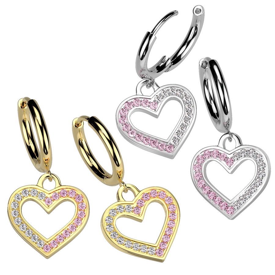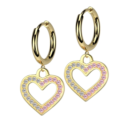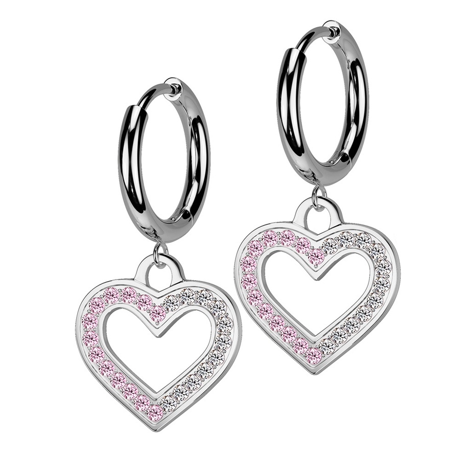 クリア & ピンク ジュエル カットアウト ハート ダングル ステンレス フープピアス 1ペア