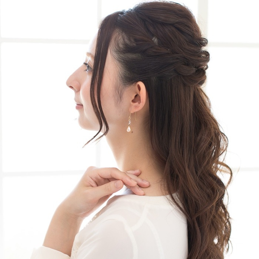 1粒ジュエルと淡水パールでベーシックなデザインながらも華やかな耳元に。