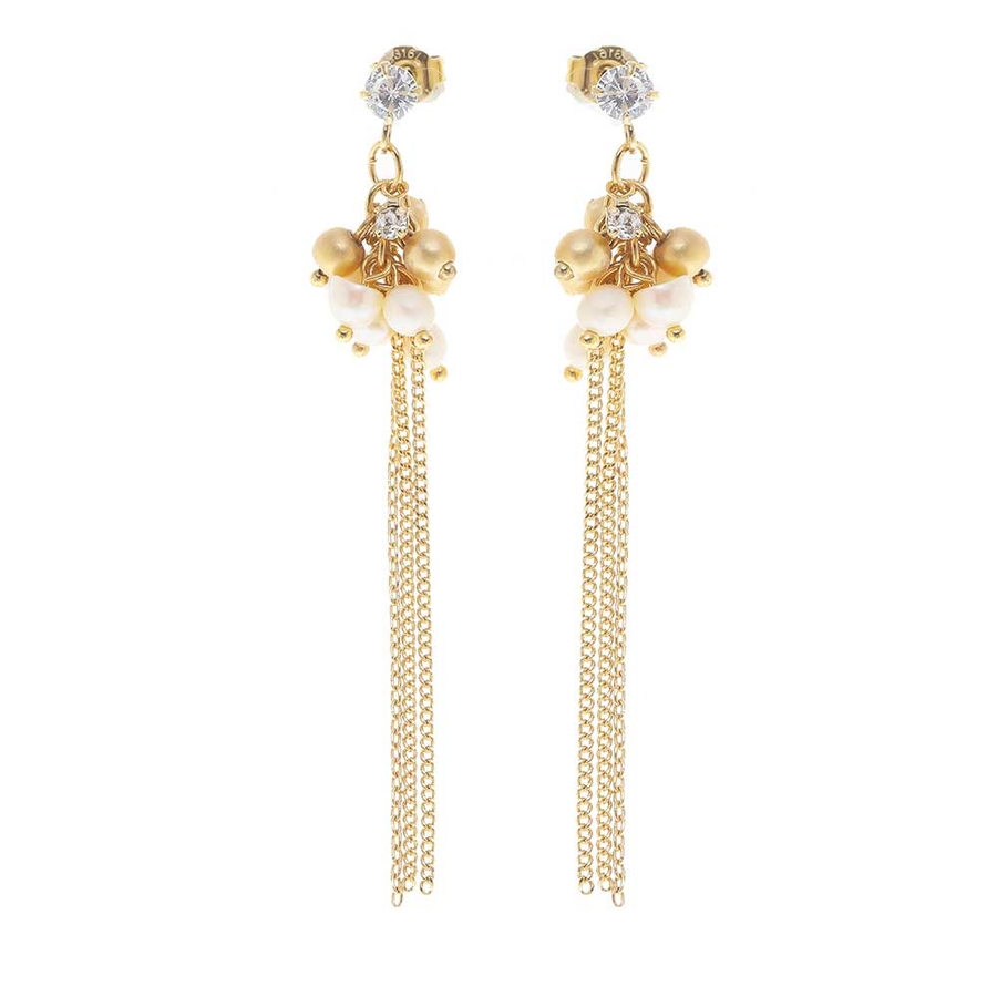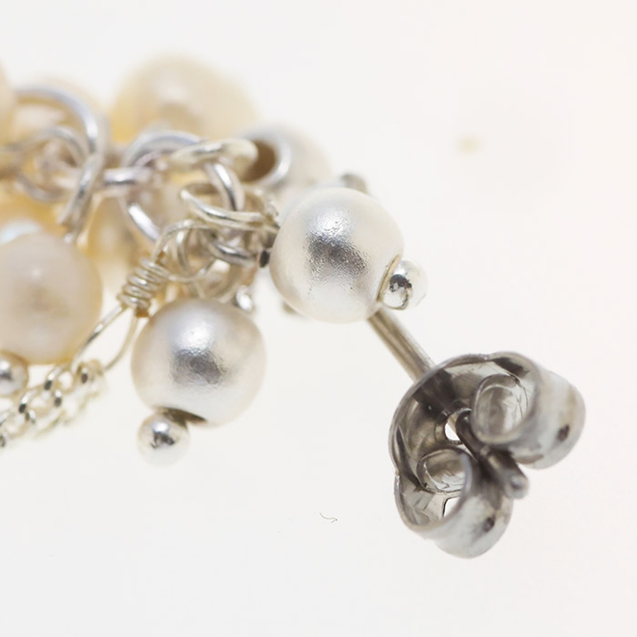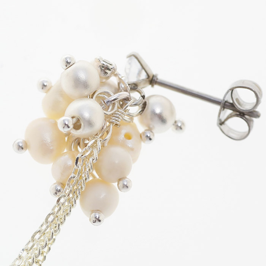 ボリューミーに飾られたパールとチェーンを合わせたロングピアス。