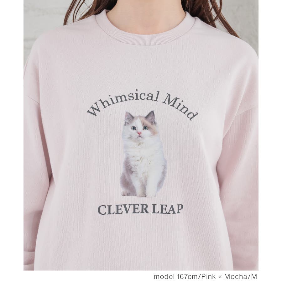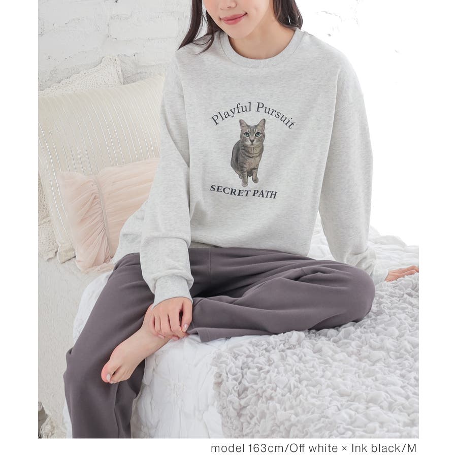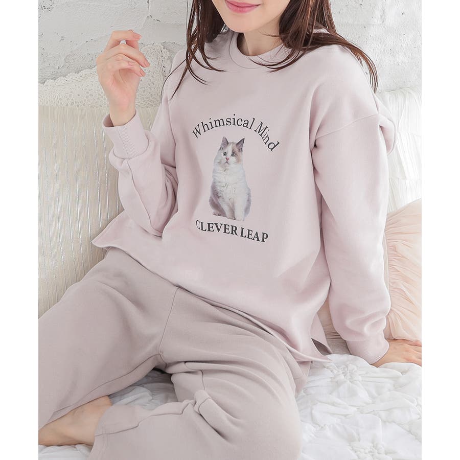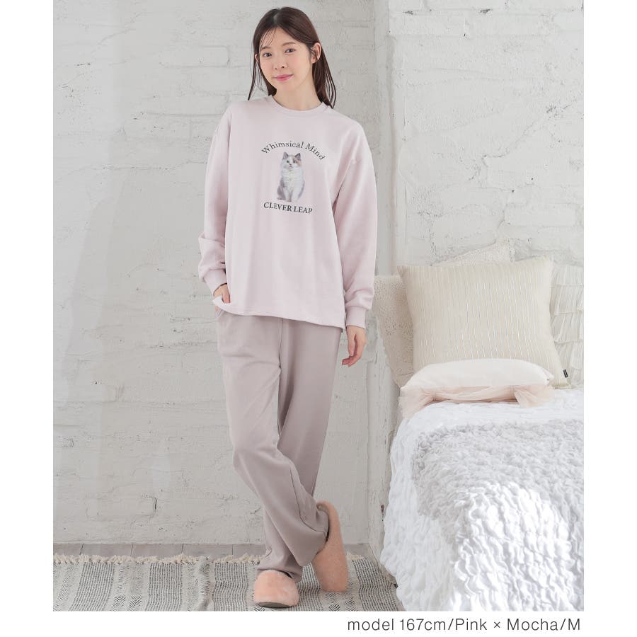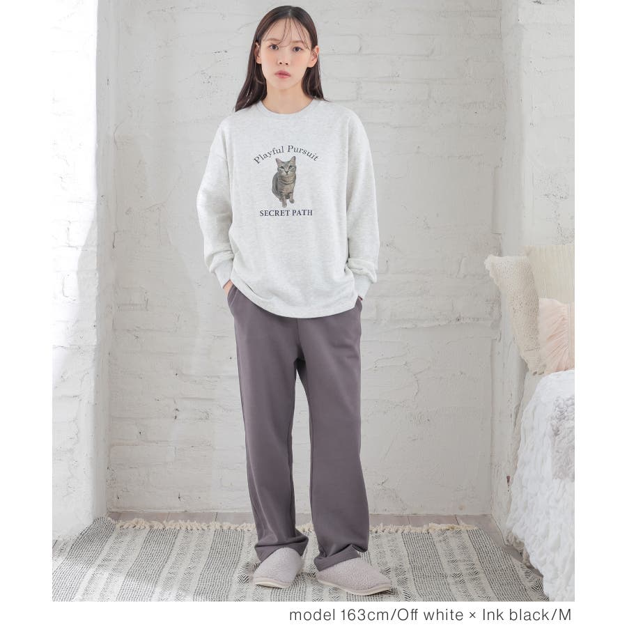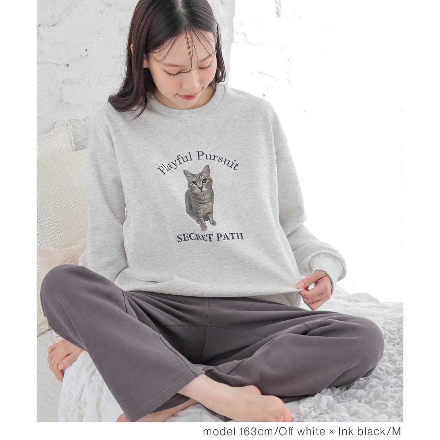 トップスは部屋着っぽくなりすぎないネコプリントが可愛いデザイン。