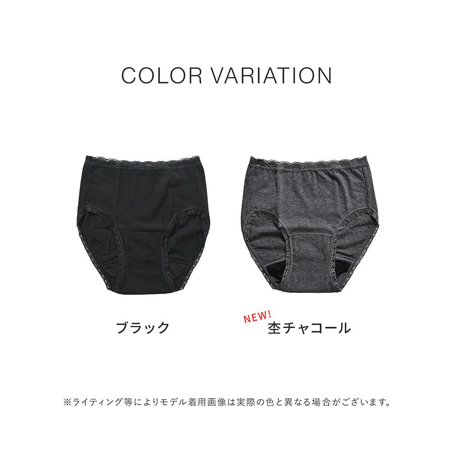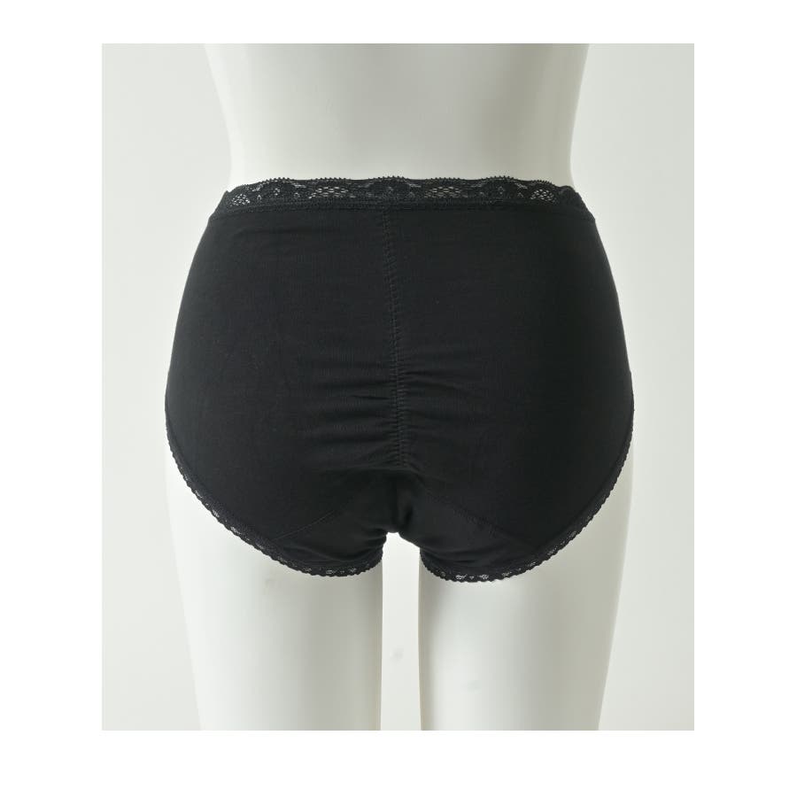 ウエスト・脚ぐりは締め付けず楽ちんなレース付きで、ボトムスにひびきにくいデザイン。