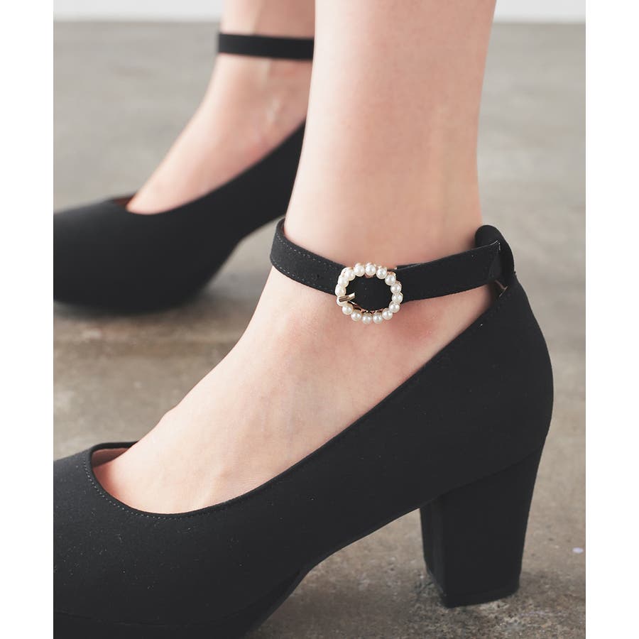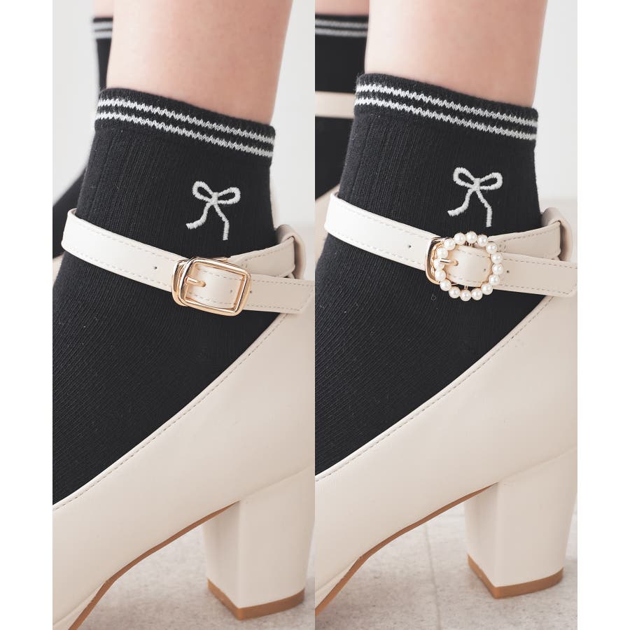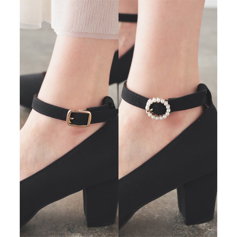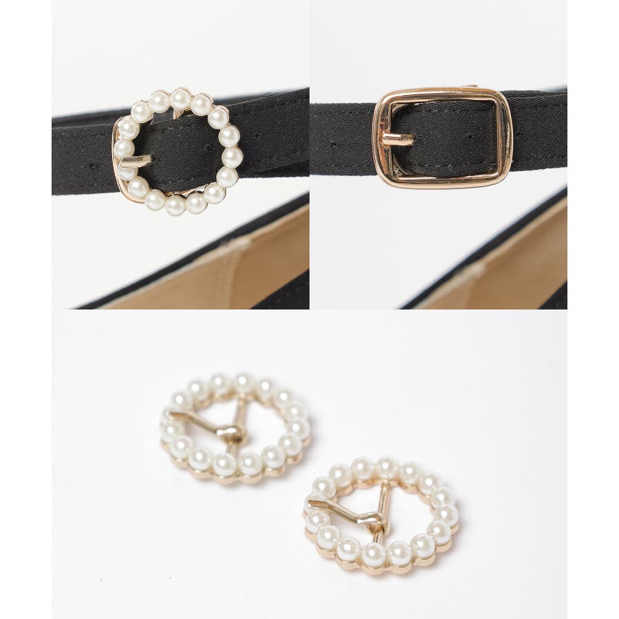 ストラップのバックルが、シンプルな角バックルとパールビジューバックルの2種類。