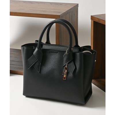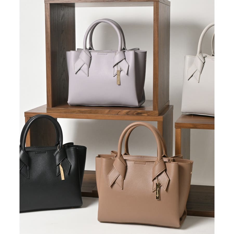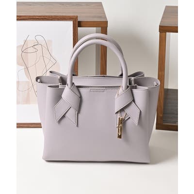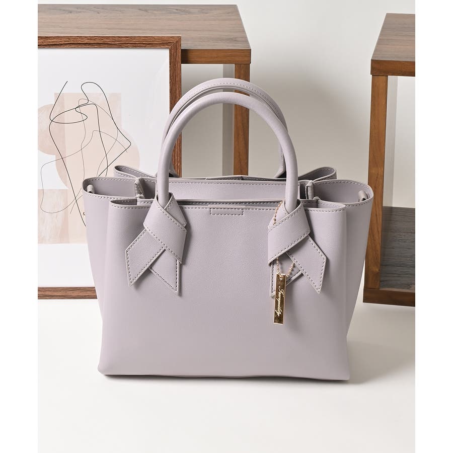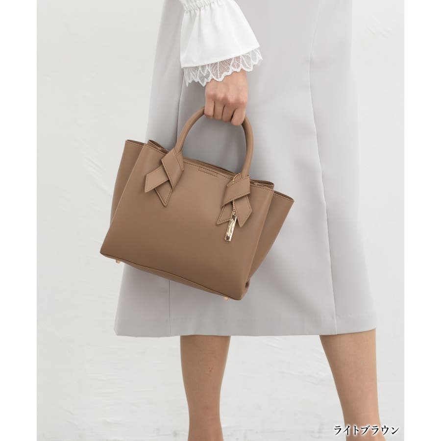 フロントのリボン風ハンドルと、ロゴ入りプレートのチャームがおしゃれなアクセント。