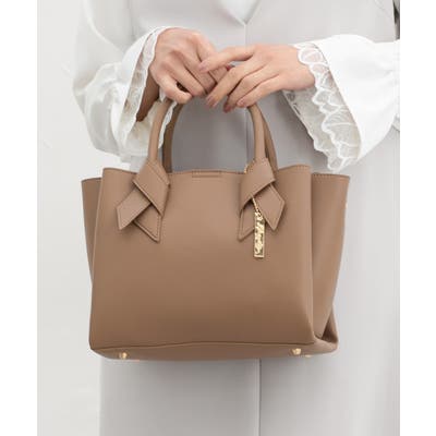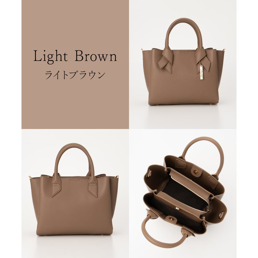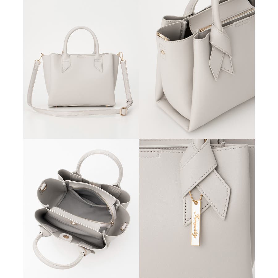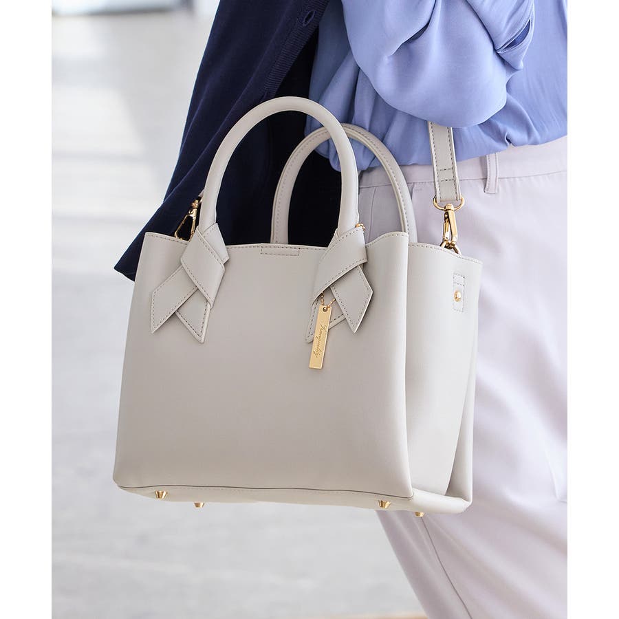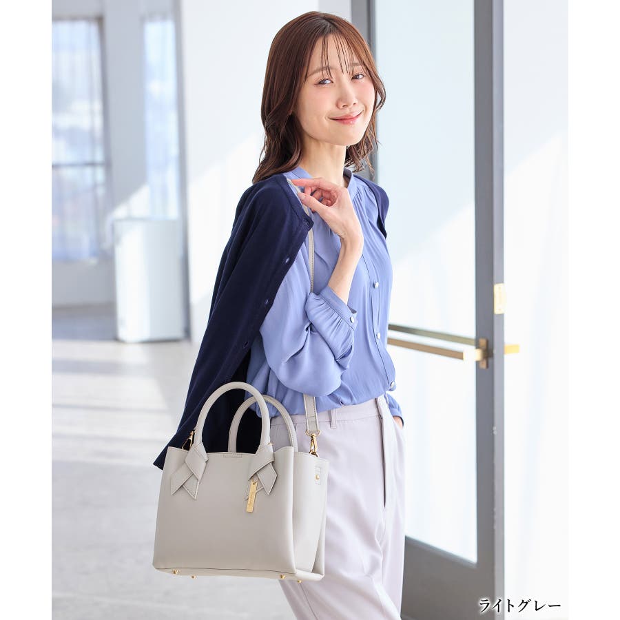 フロントのリボン風ハンドルと、ロゴ入りプレートのチャームがおしゃれなアクセント。