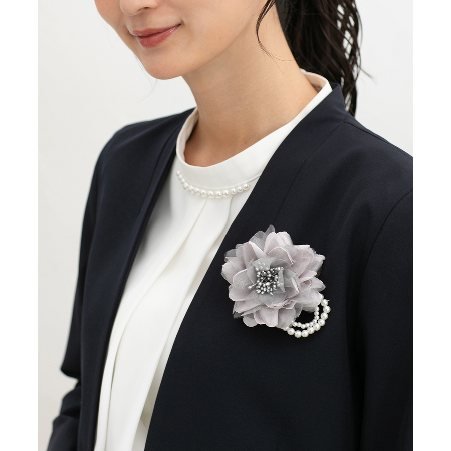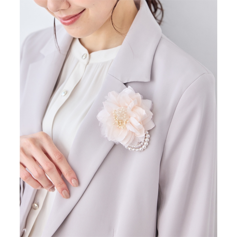 ふんわりとした花びらを重ねたボリューム感のあるコサージュ。