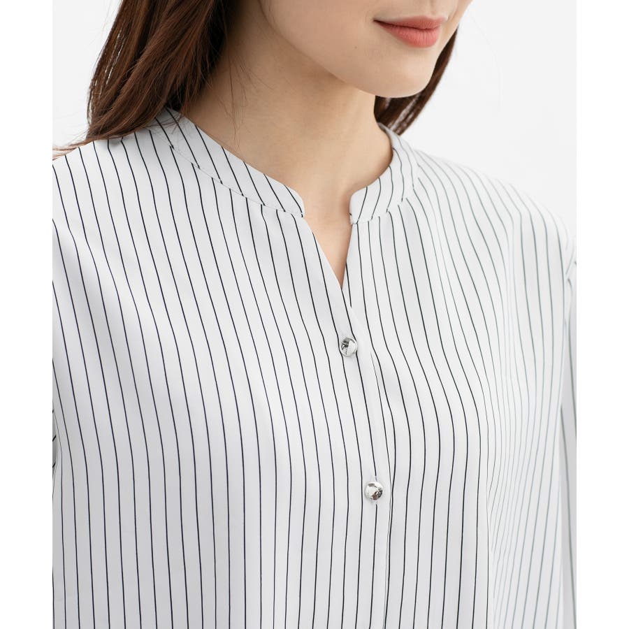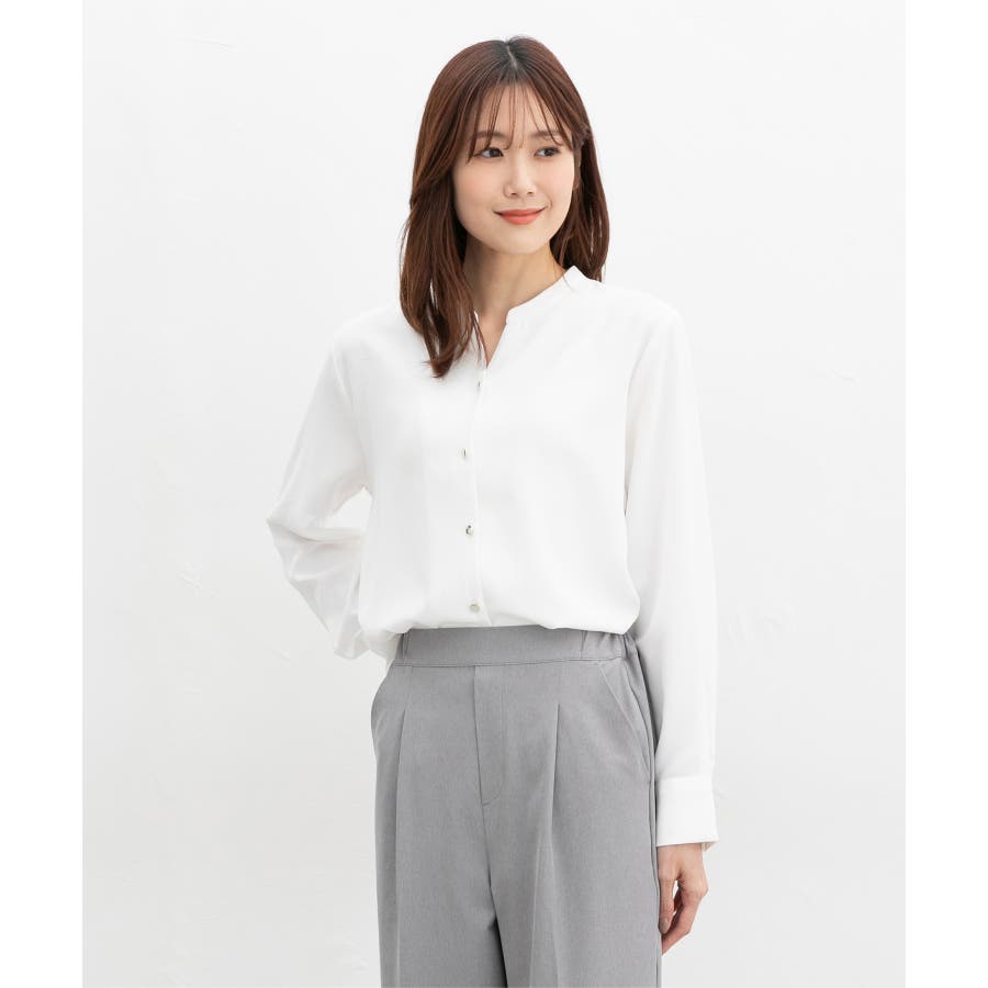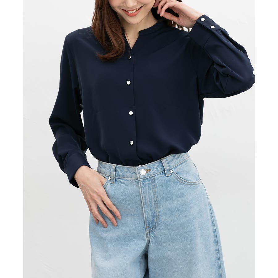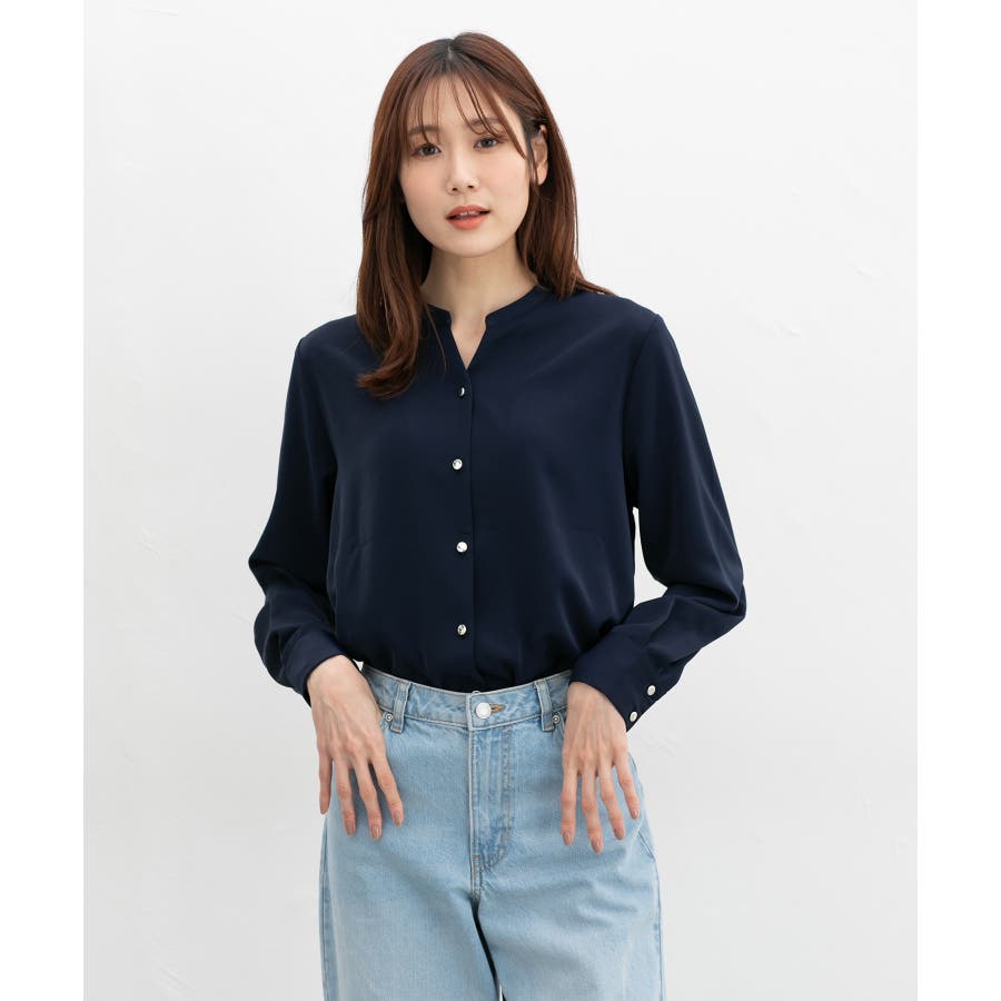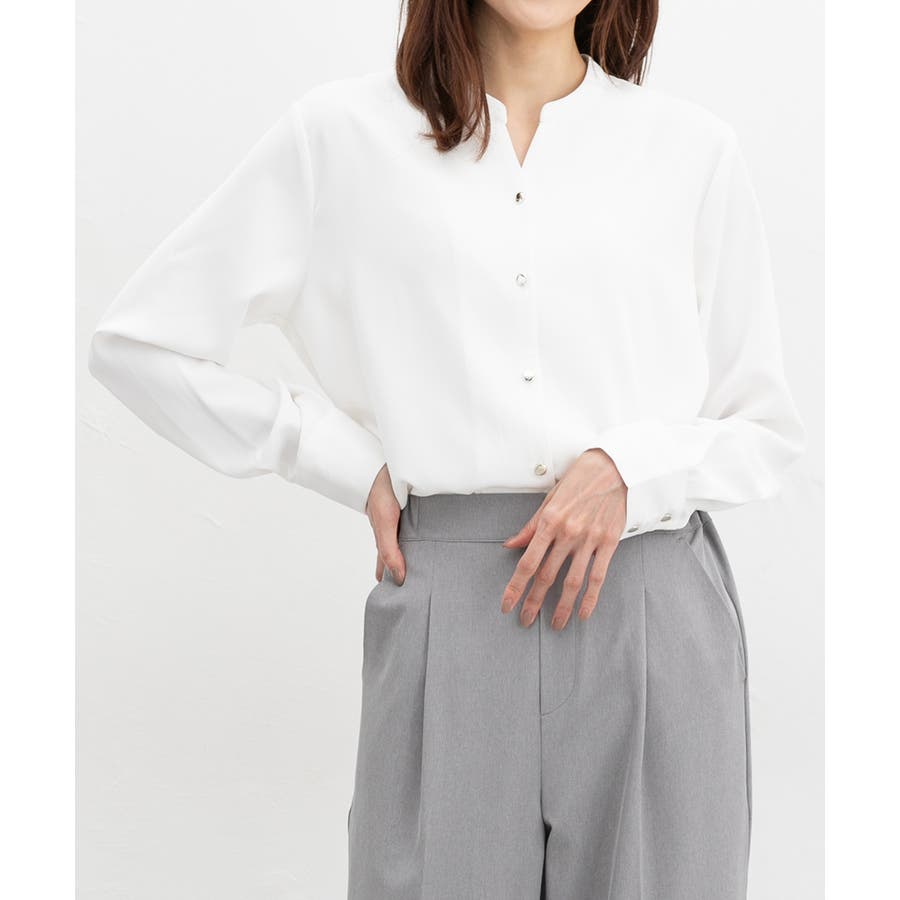 首元がすっきりきれいに見えるマオカラーのスキッパーデザイン。
