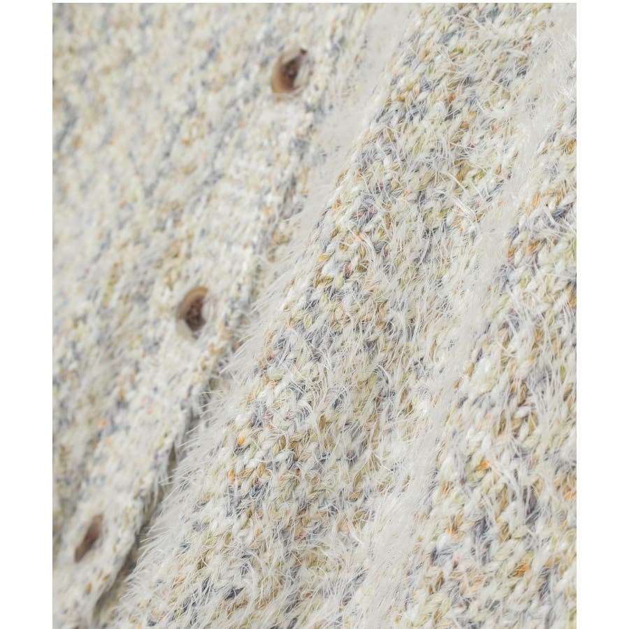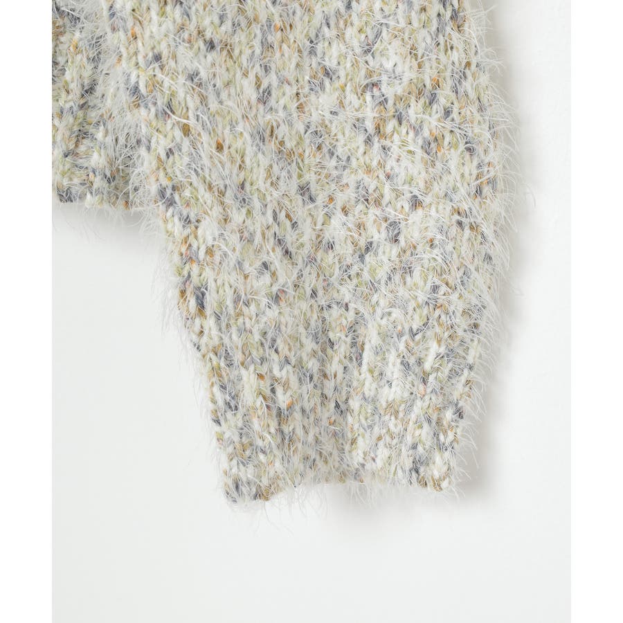 毛足が長めで柔らかくふわふわなフェザーヤーンと、ポコポコとした糸を使用したニット素材。