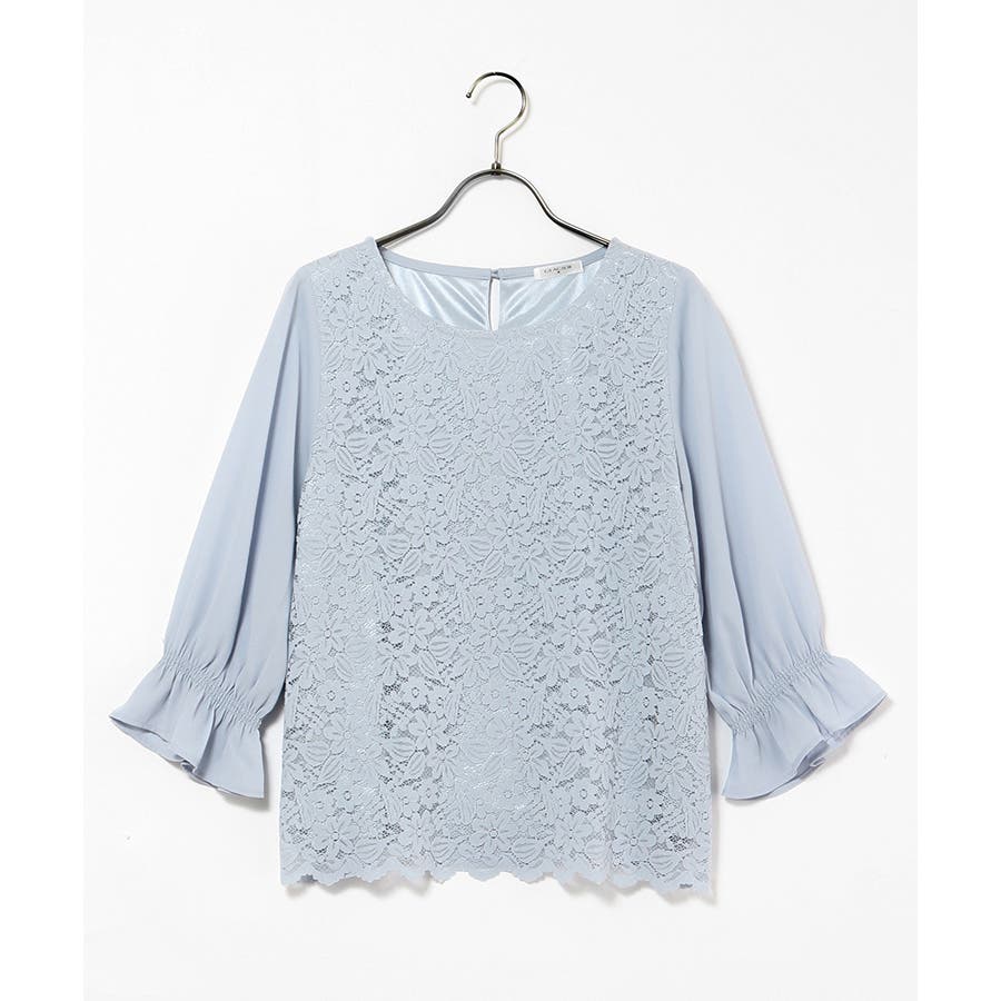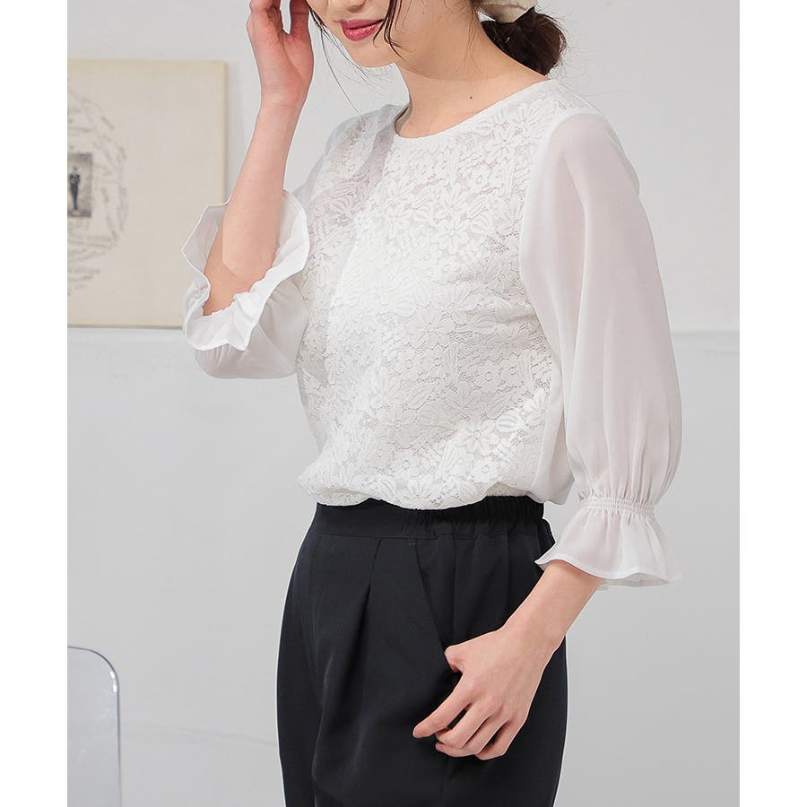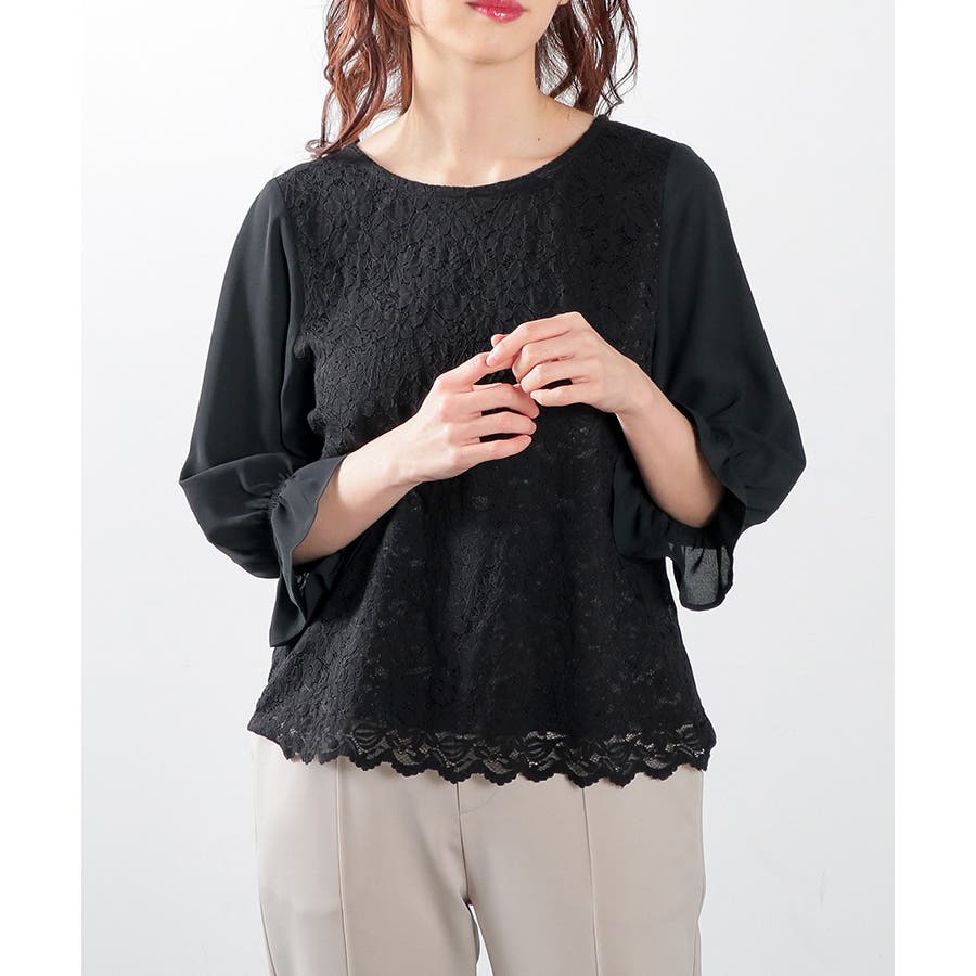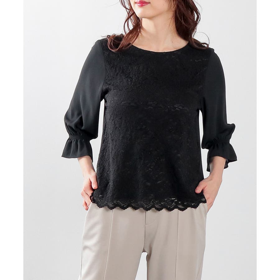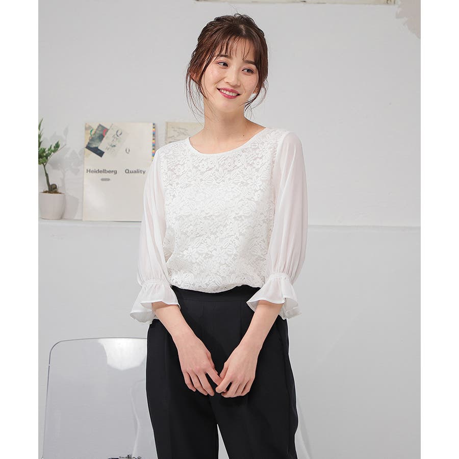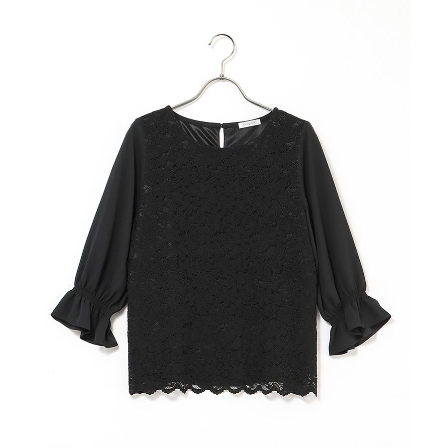 前身頃の花柄レース使いが華やかな7分袖トップス。
