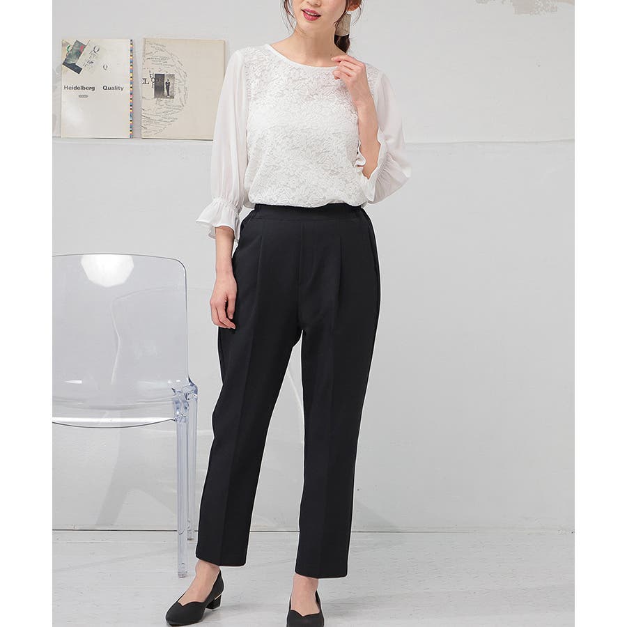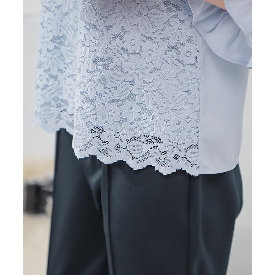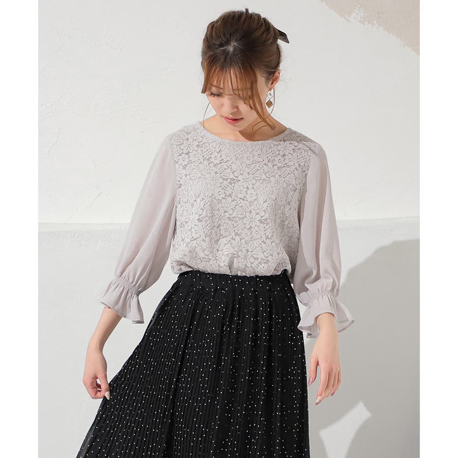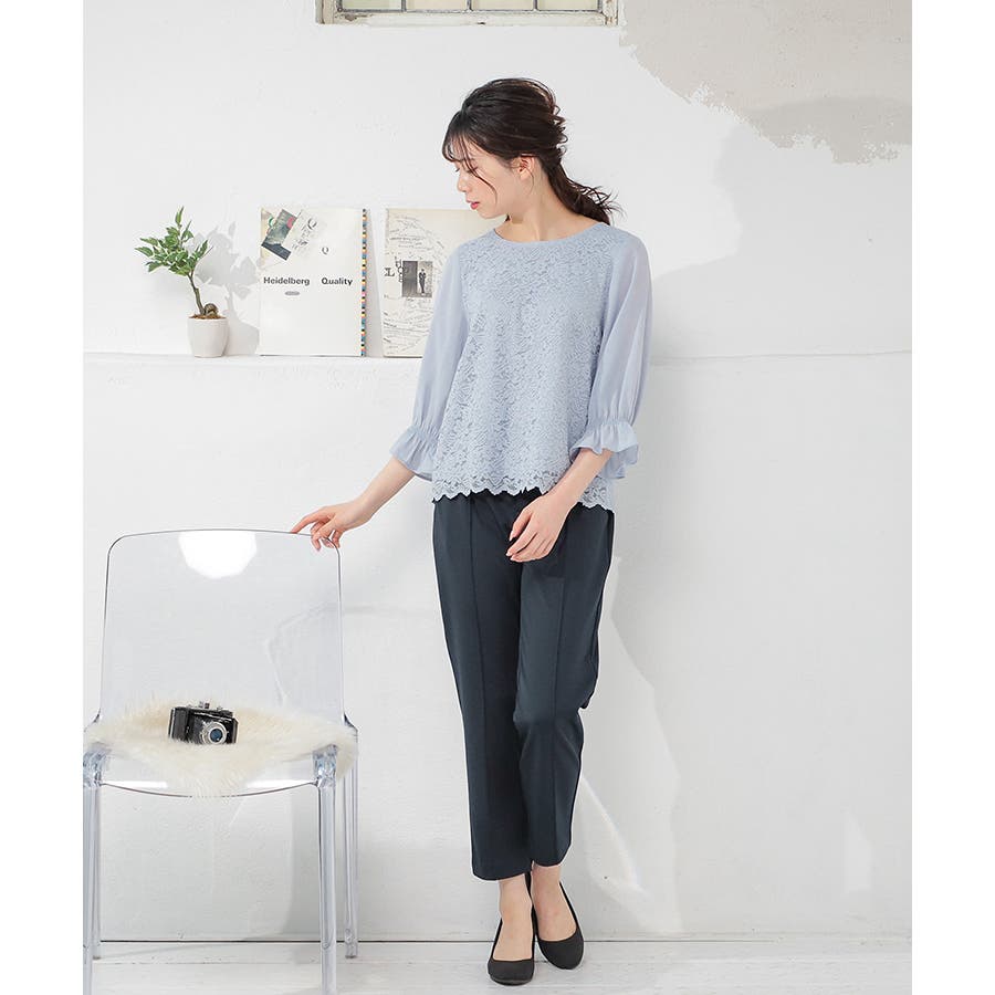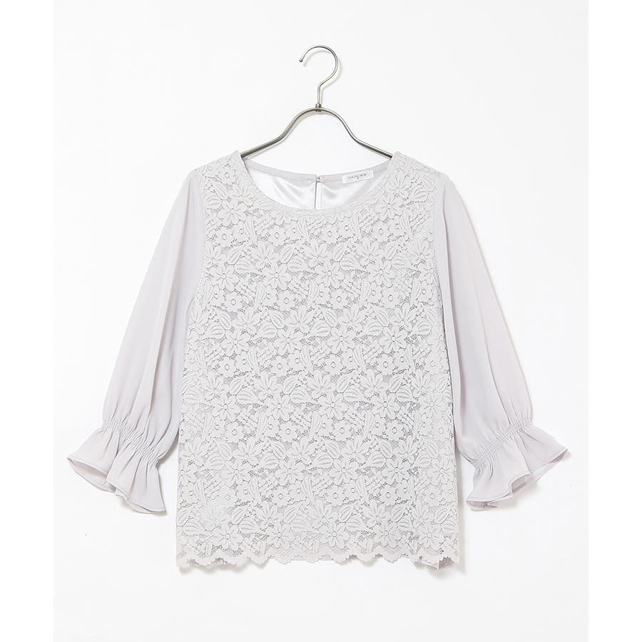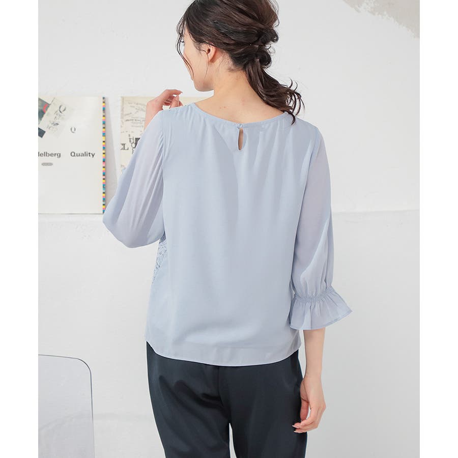 前身頃の花柄レース使いが華やかな7分袖トップス。