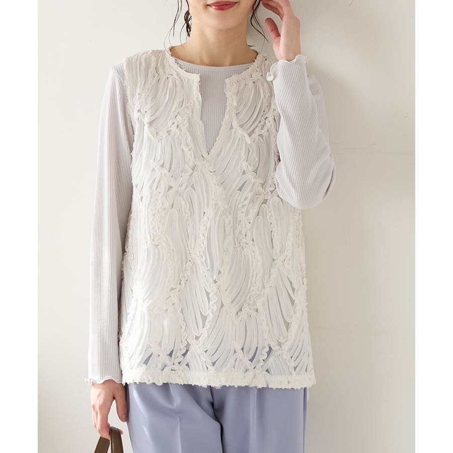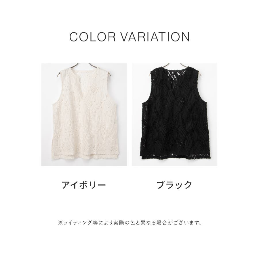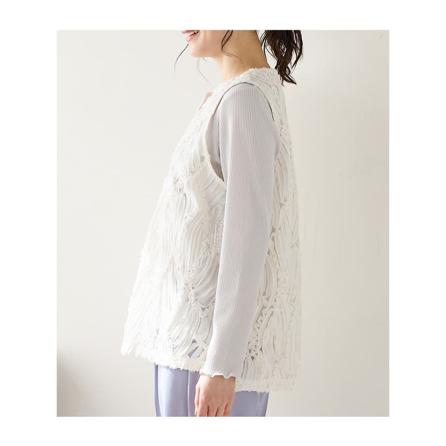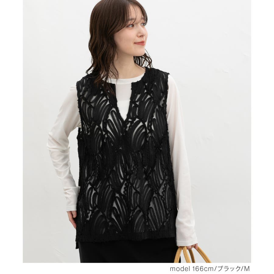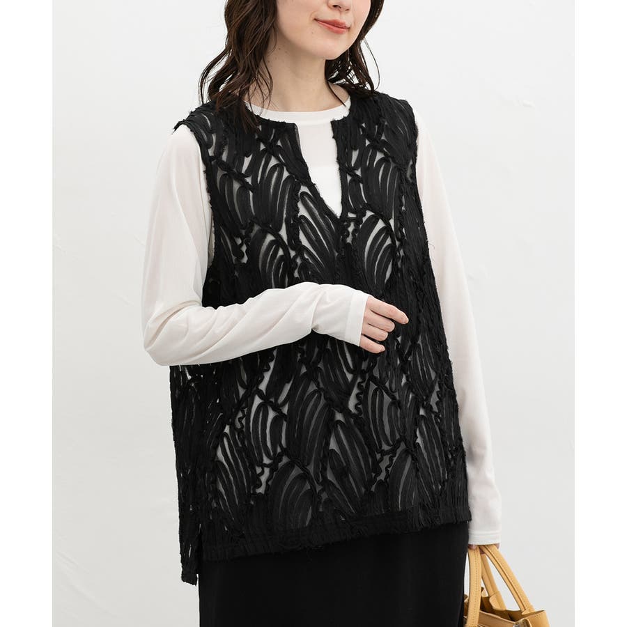 商品カテゴリ:5340139950 トップス カットソー ノースリーブ ベスト ジレ レース チュール キーネック スリット カジュアル オールシーズン 白 黒 カテゴリ101000 tops プルオーバー 袖なし スリーブレス 肩出し 重ね着 レイヤード シフォンテープ刺繍 刺繍レース 透け感 シアー Vネック スリット入り サイドスリット 後ろ下がり 前後差 フェミニン 大人可愛い フェミカジュ おしゃれ 大人カジュアル Sサイズ S 小さいサイズ Mサイズ Lサイズ LLサイズ LL 大きいサイズ FP501 大人 20代 30代 40代 50代 アラサー アラフォー アラフィフ OL トレンド 流行 シーズンオール 春 春物 春服 春夏 夏 夏物 夏服 秋 秋物 秋服 秋冬 冬 冬物 冬服 新作 新着 アイボリー ホワイト ブラック 9950 534-13-9950 5340139950 GLACIER グラシア honeys ハニーズ レディースファッション ladies fashion 女性 女 レディース ファッション 女性服 服 婦人服 534013995031 レースベスト 価格2980
