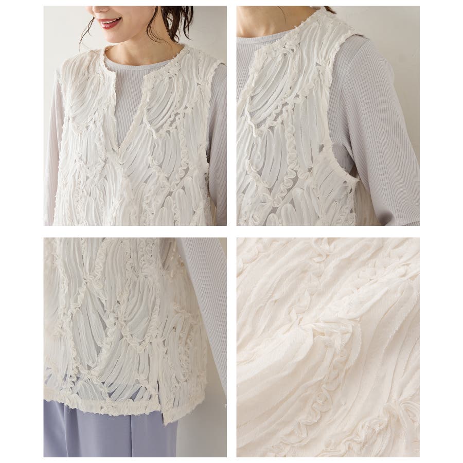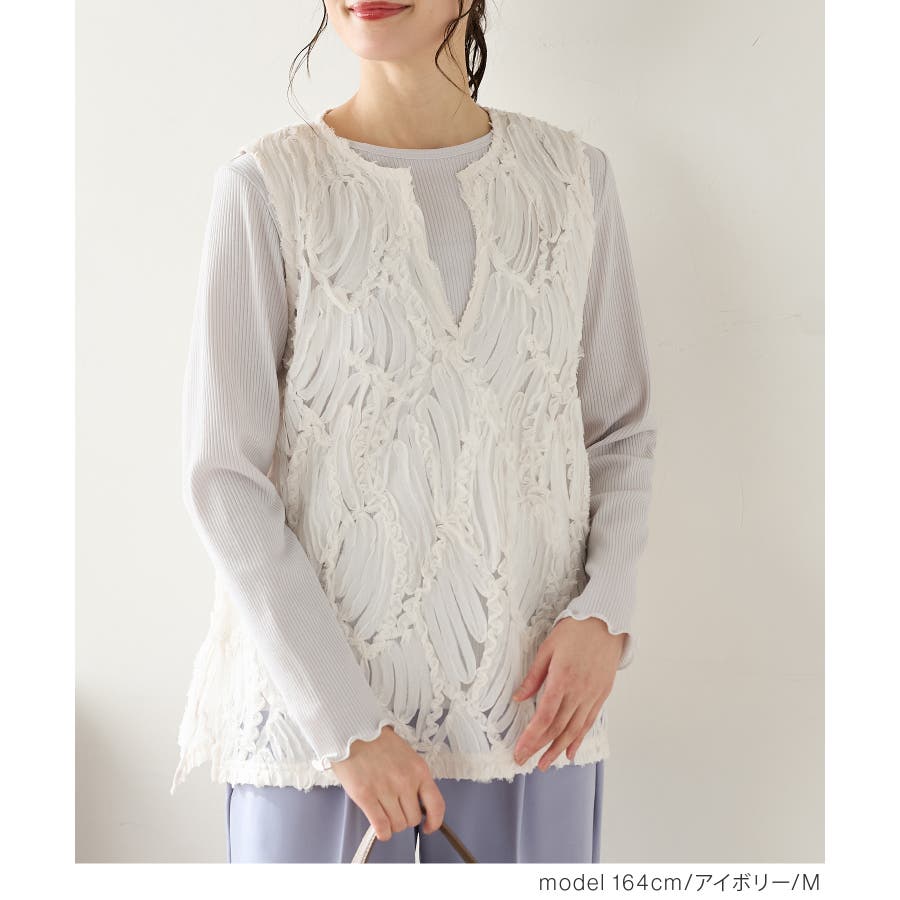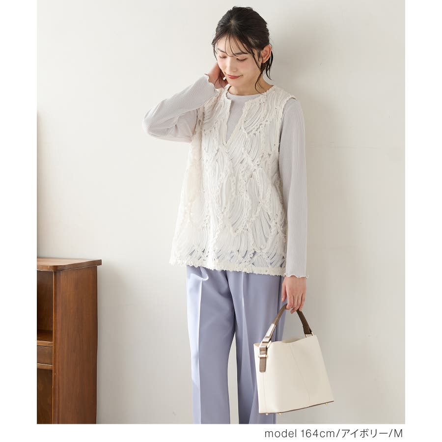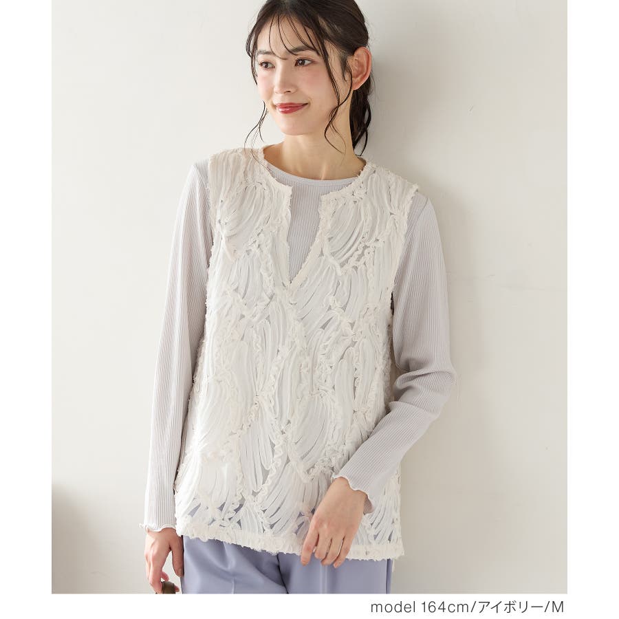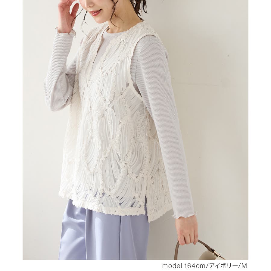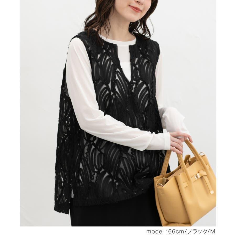 商品カテゴリ:5340139950 トップス カットソー ノースリーブ ベスト ジレ レース チュール キーネック スリット カジュアル オールシーズン 白 黒 カテゴリ101000 tops プルオーバー 袖なし スリーブレス 肩出し 重ね着 レイヤード シフォンテープ刺繍 刺繍レース 透け感 シアー Vネック スリット入り サイドスリット 後ろ下がり 前後差 フェミニン 大人可愛い フェミカジュ おしゃれ 大人カジュアル Sサイズ S 小さいサイズ Mサイズ Lサイズ LLサイズ LL 大きいサイズ FP501 大人 20代 30代 40代 50代 アラサー アラフォー アラフィフ OL トレンド 流行 シーズンオール 春 春物 春服 春夏 夏 夏物 夏服 秋 秋物 秋服 秋冬 冬 冬物 冬服 新作 新着 アイボリー ホワイト ブラック 9950 534-13-9950 5340139950 GLACIER グラシア honeys ハニーズ レディースファッション ladies fashion 女性 女 レディース ファッション 女性服 服 婦人服 534013995031 レースベスト 価格2980