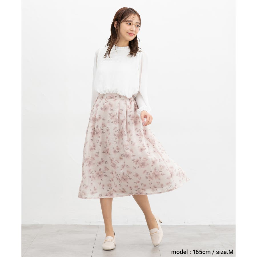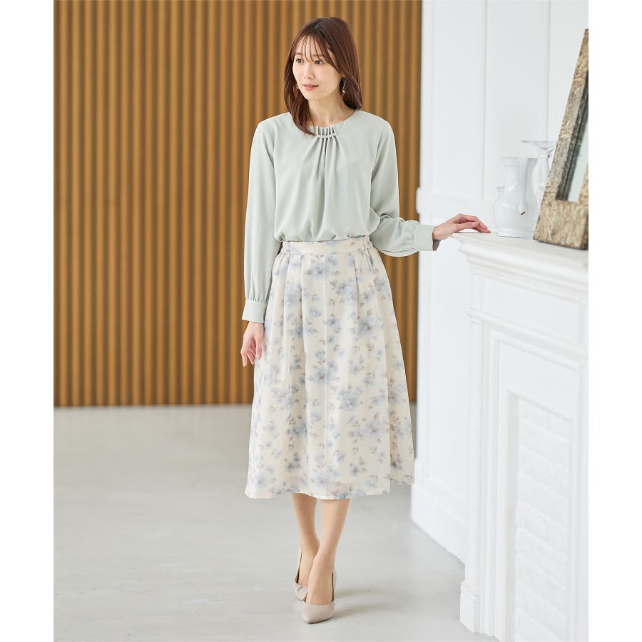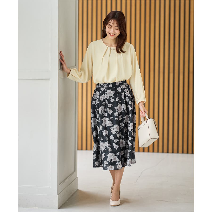 華やかなスカートを主役に、シンプルなトップスを合わせた上品コーデがおすすめ。