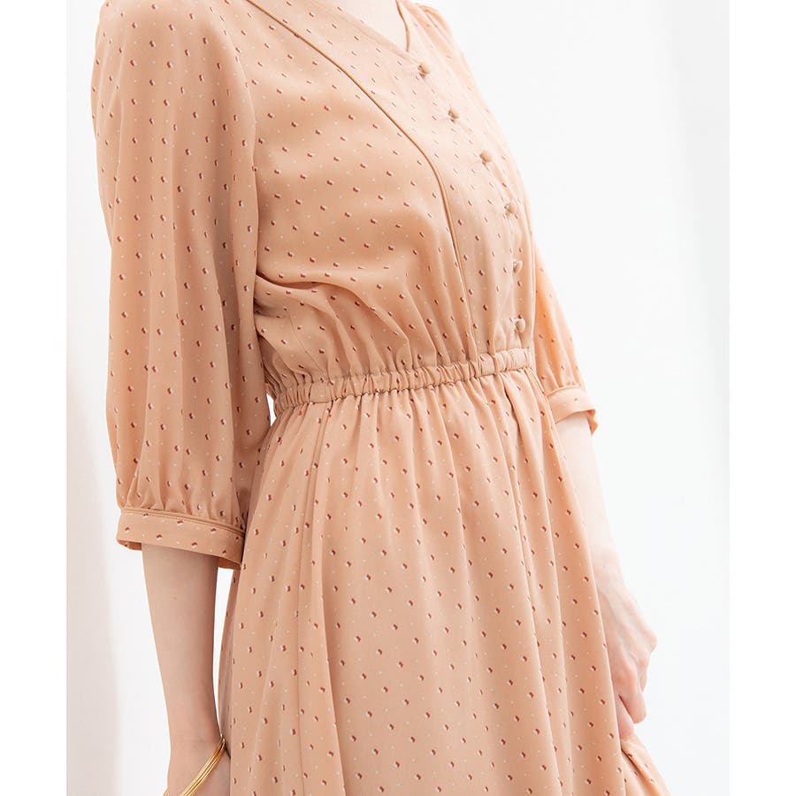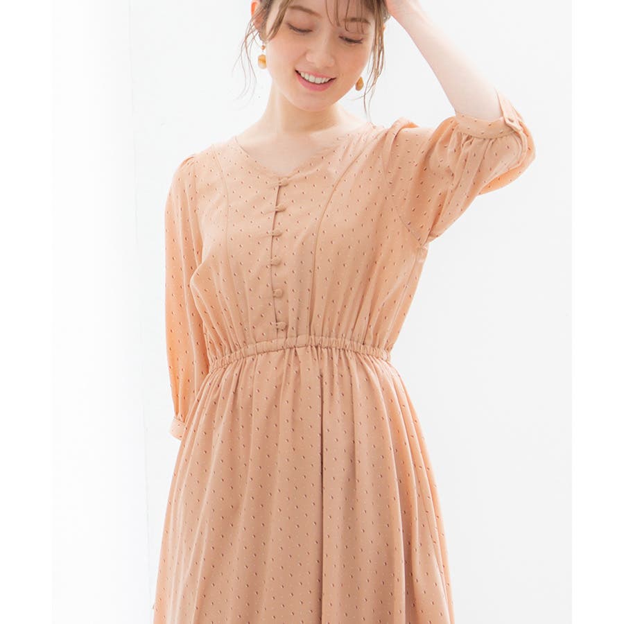 トレンドライクな配色使いと、くるみボタンが大人かわいい6分袖ワンピース。