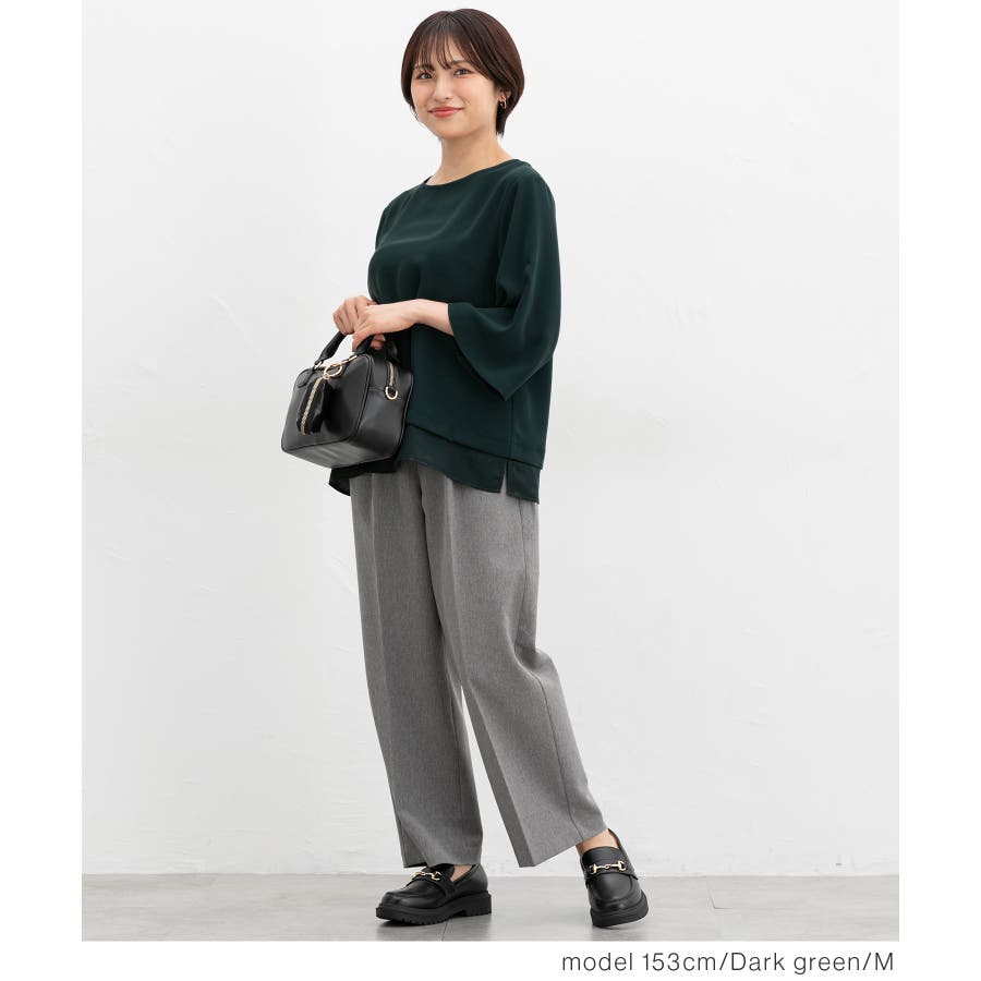 ふんわりシルエットと長めのフレアスリーブで気になる体型も二の腕もしっかりカバー。