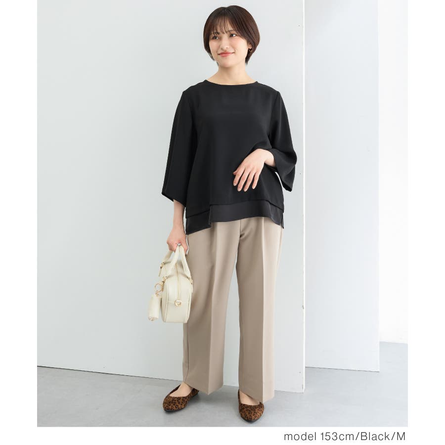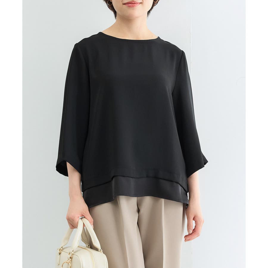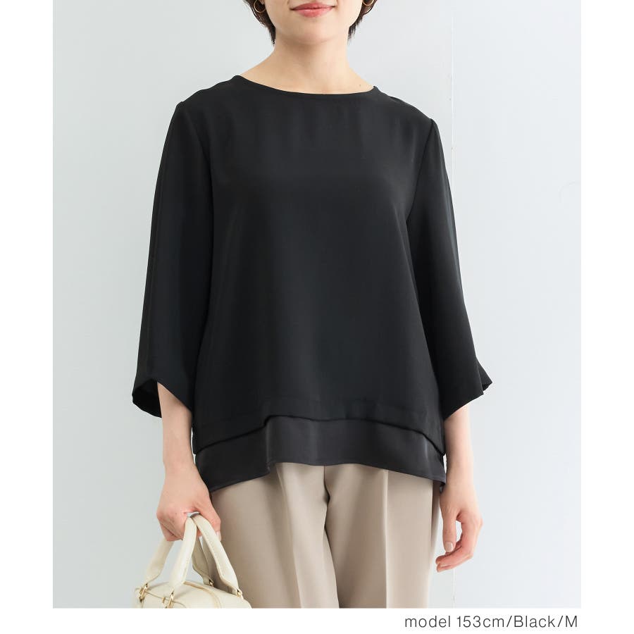 裾からドレープ感のあるサテン生地をのぞかせたレイヤード風で、1枚でも着映えする上品デザイン。