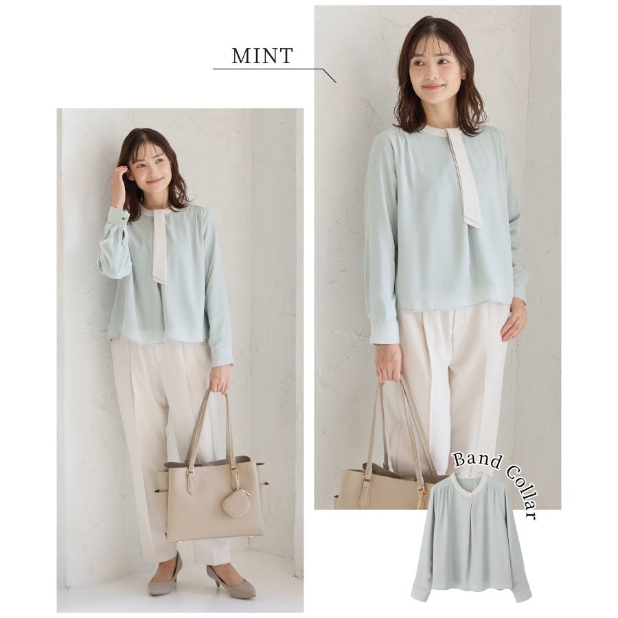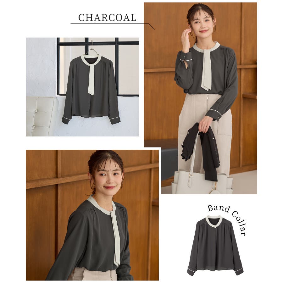 バンドカラーの衿と袖口も配色使いで、シンプルになりすぎないのも嬉しいポイント。
