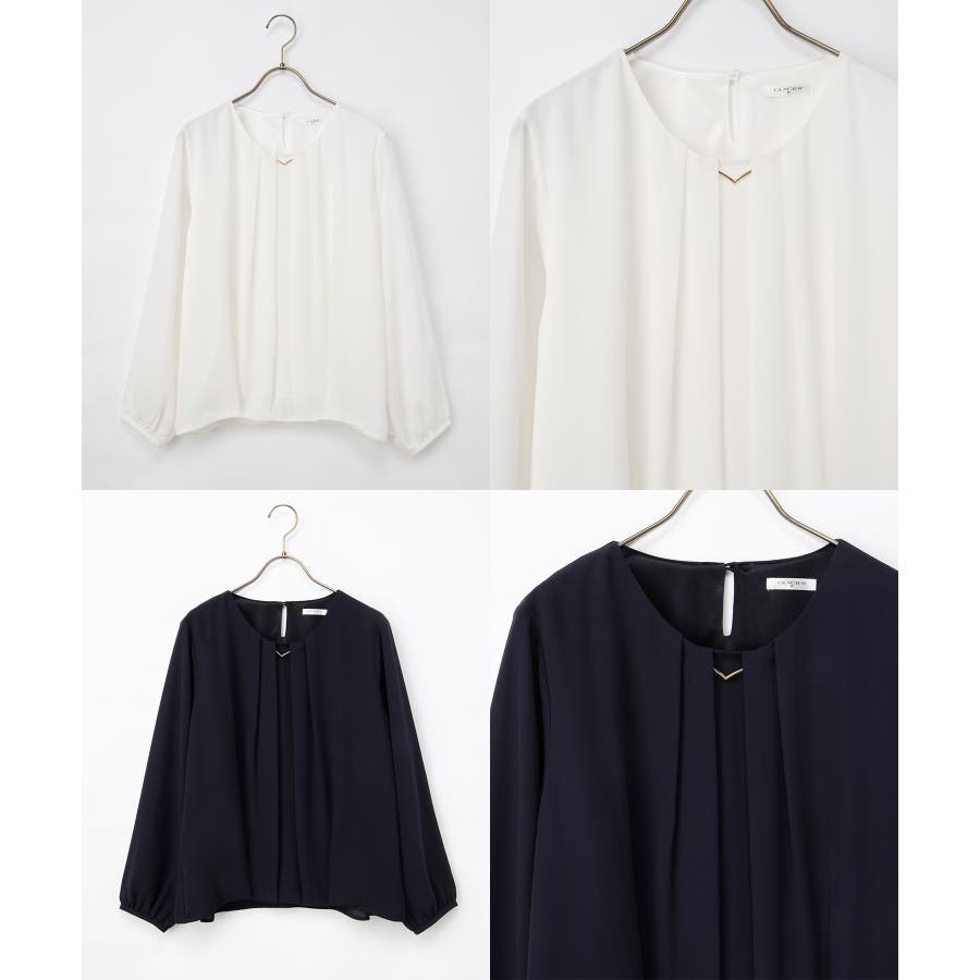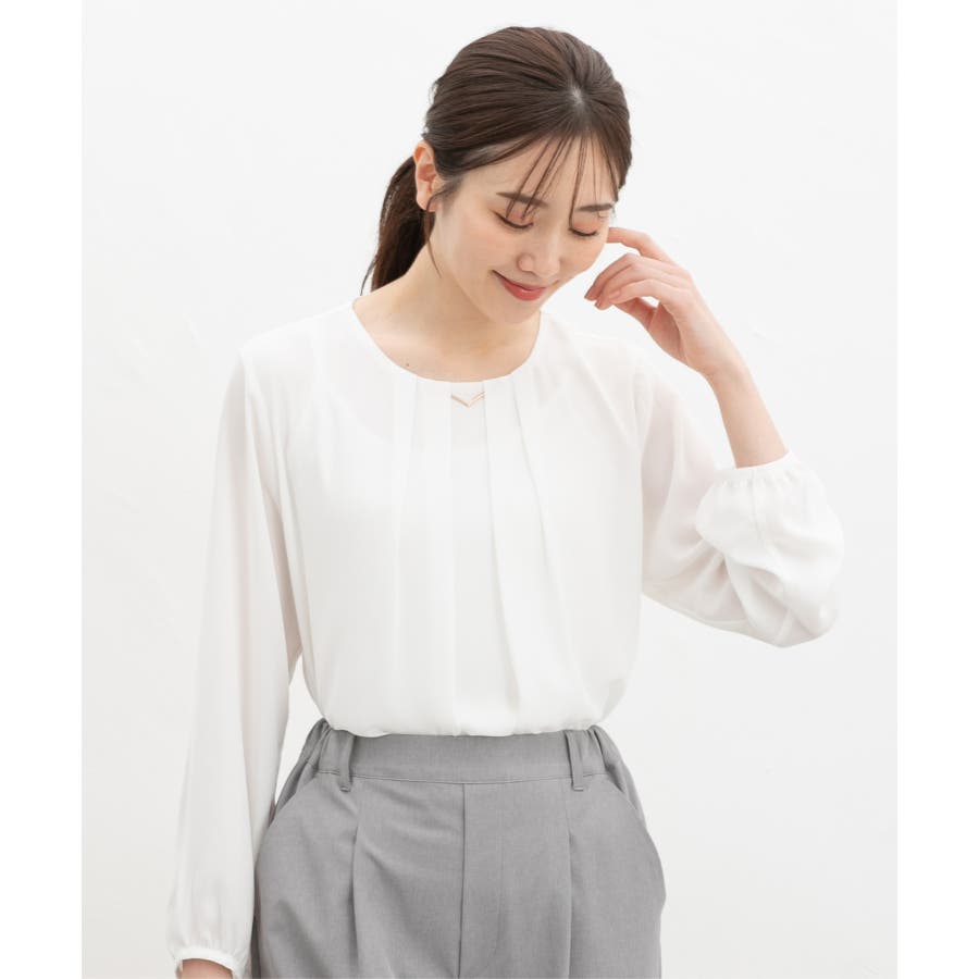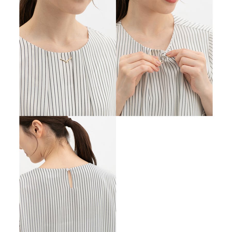 衿元にさりげない華やかさをプラスするメタルパーツのアクセサリーは、シーンやコーデに合わせて取り外し可能。