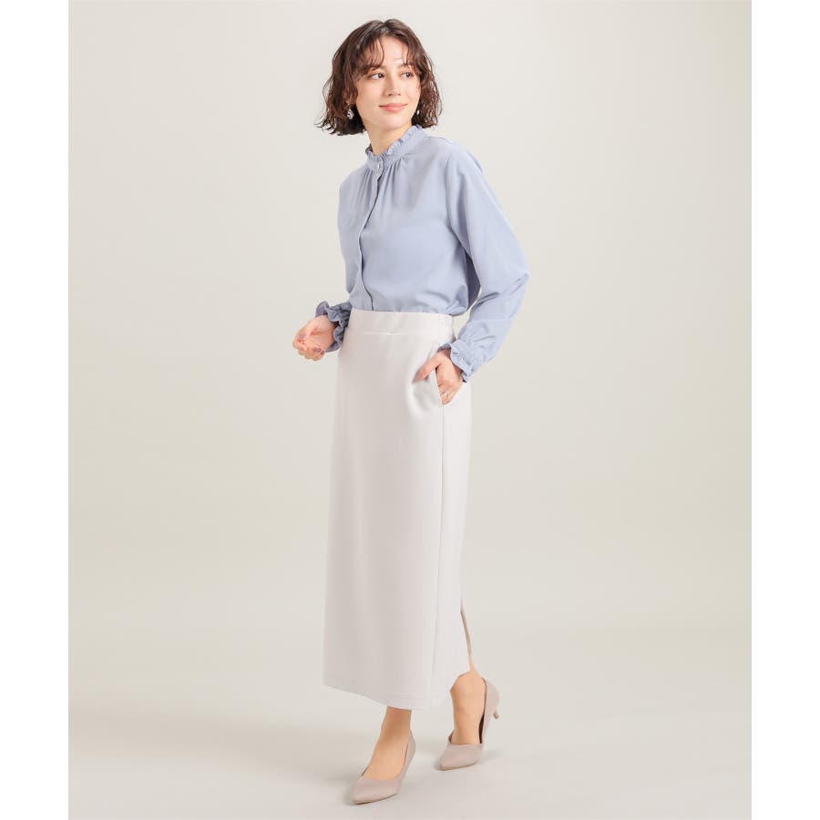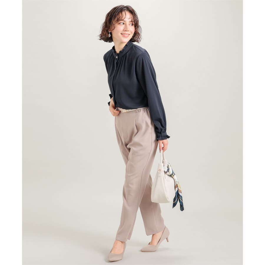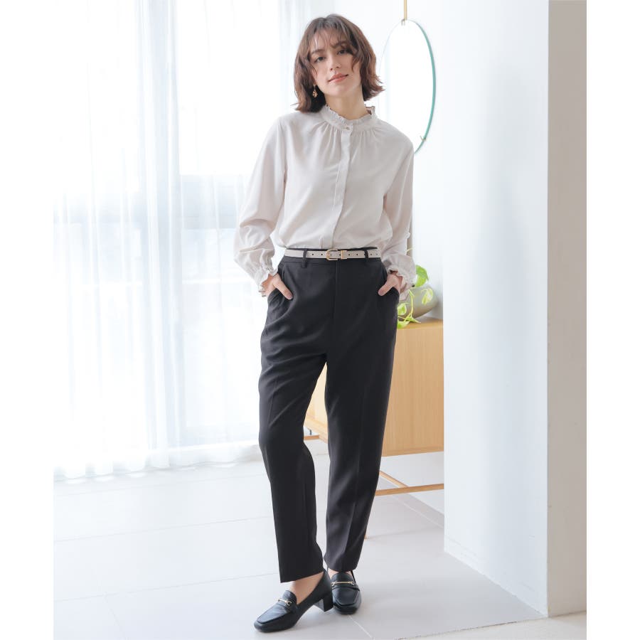 スタンドネックの衿ぐりと袖口にフリルを付けたフェミニンなデザイン。