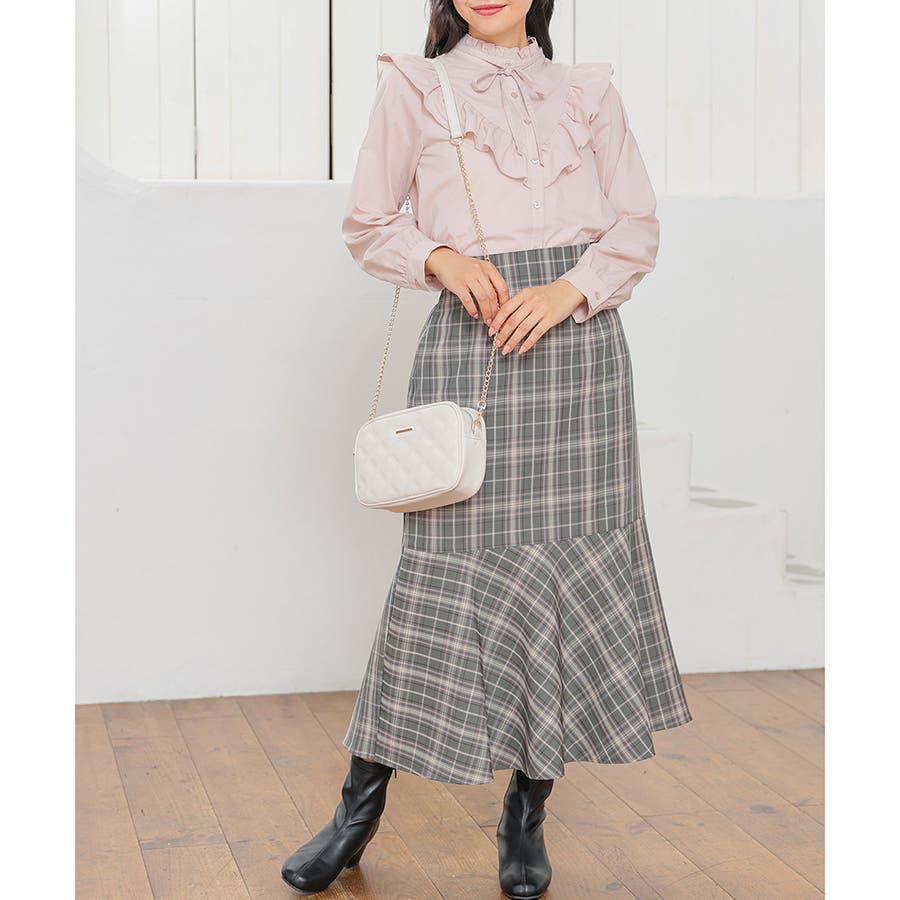 後ろまでのたっぷり肩フリルと、共ひもの細リボンがガーリーなデザイン。