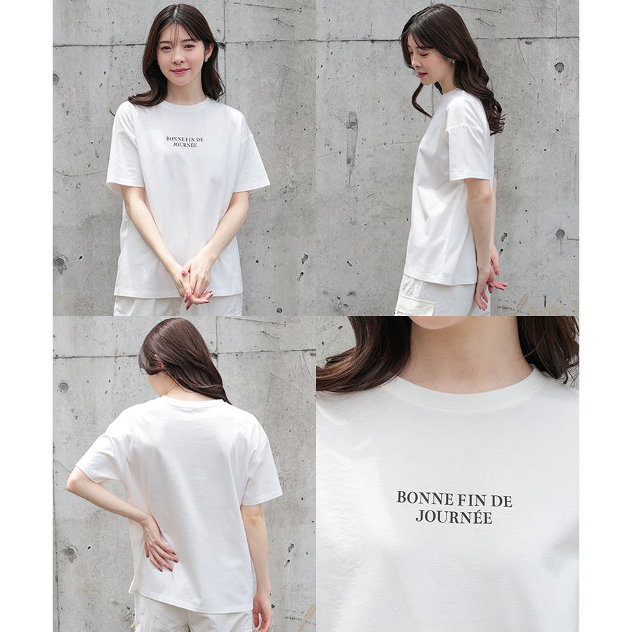 Tシャツもゆったりめで、おしゃれフォントの控えめロゴがこなれ感を演出。