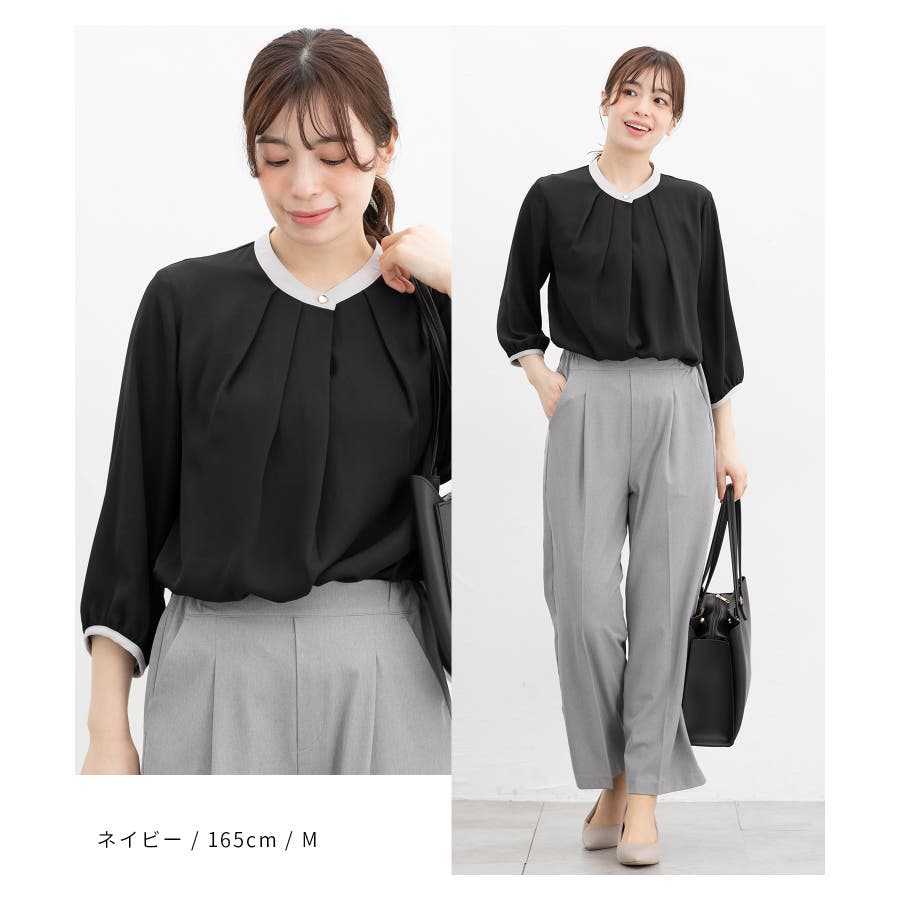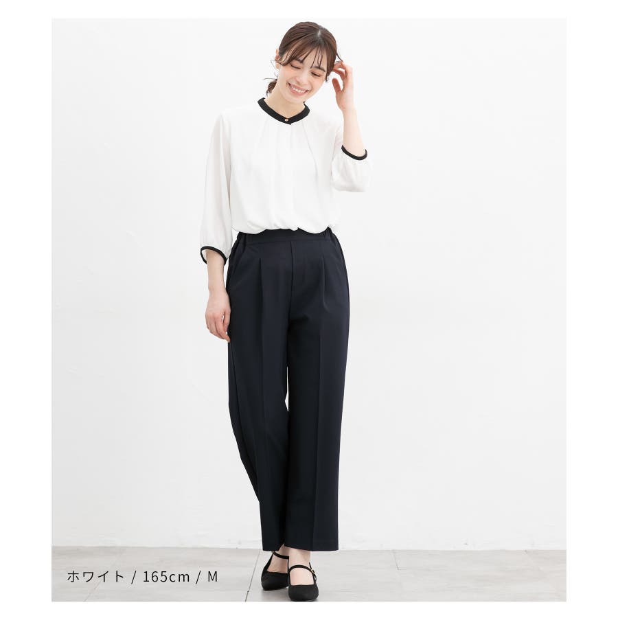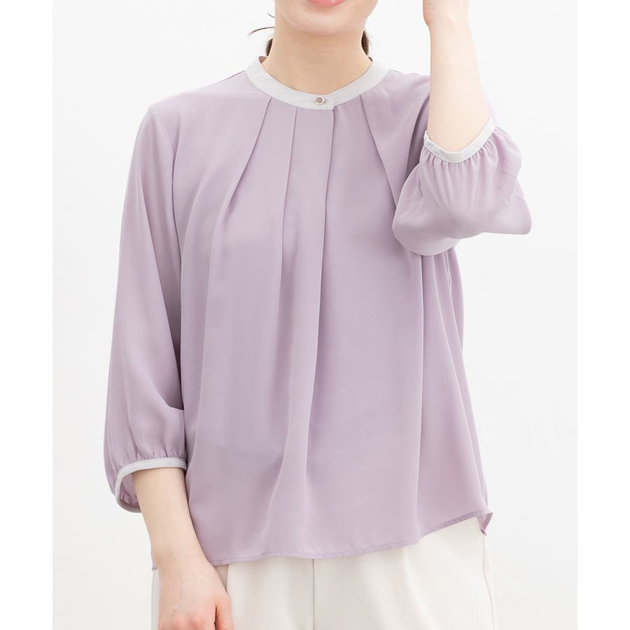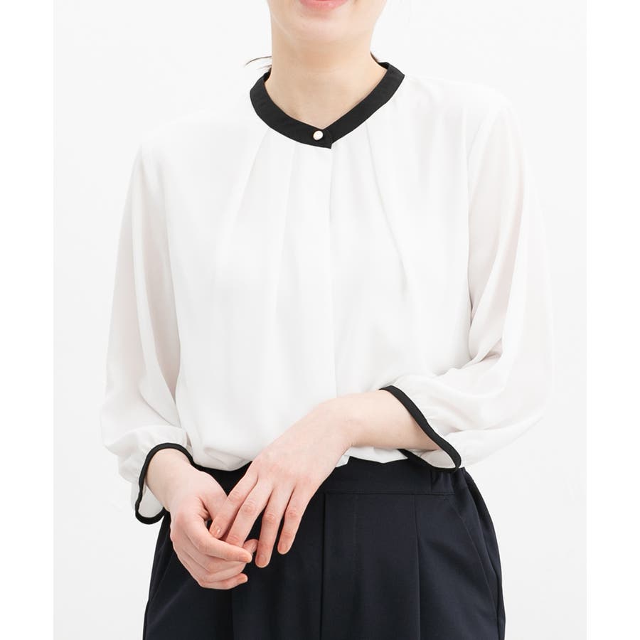 フェミニンなバンドカラーのえりぐりに配色をプラスした上品なデザイン。