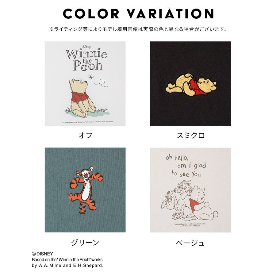 ディズニーキャラクター「プーさん」と仲間たちの刺繍やプリントが大人可愛いデザイン。