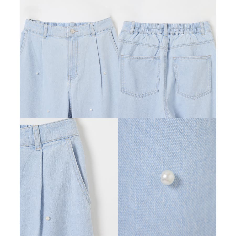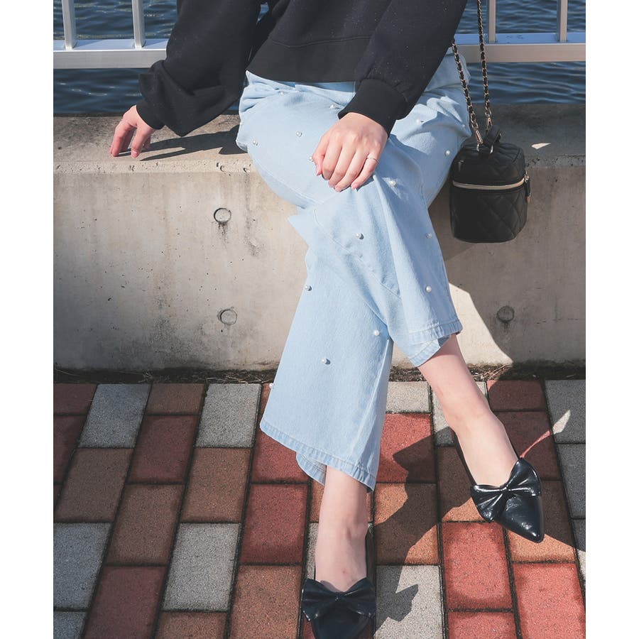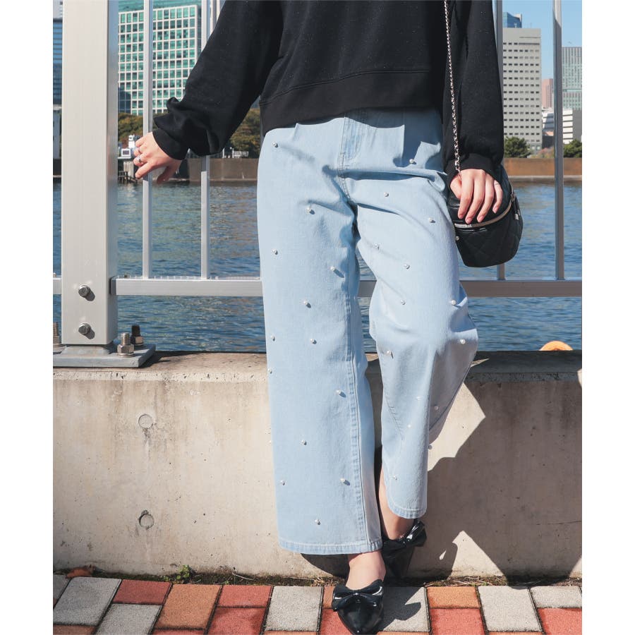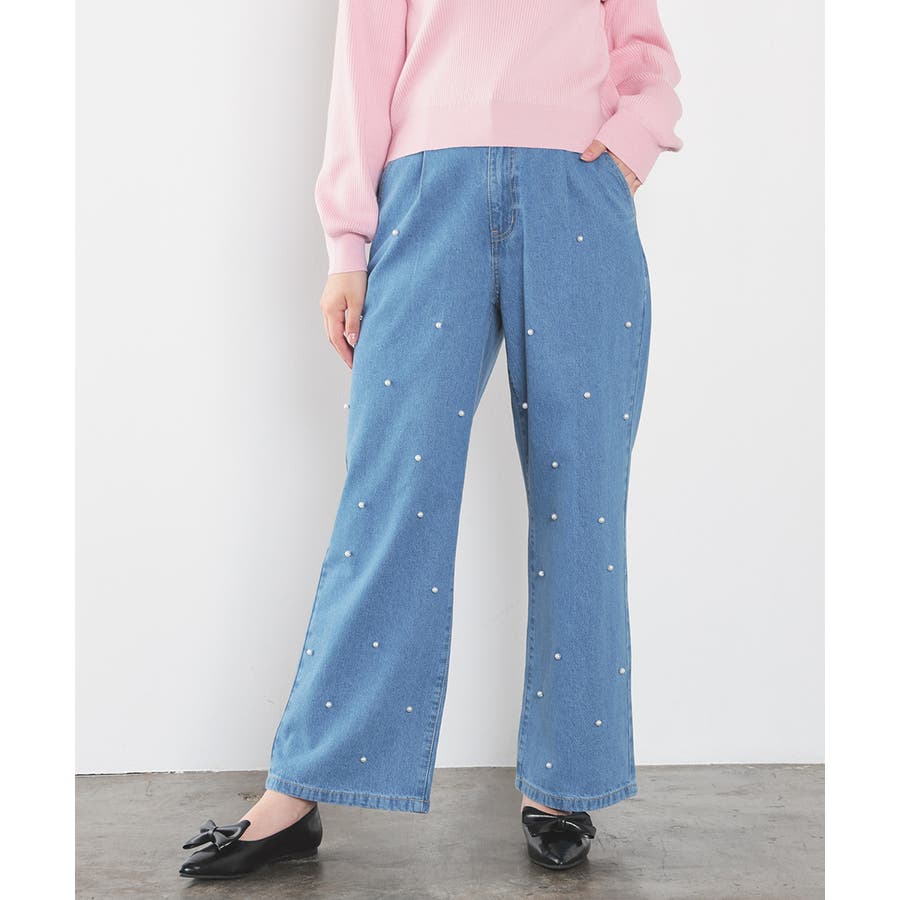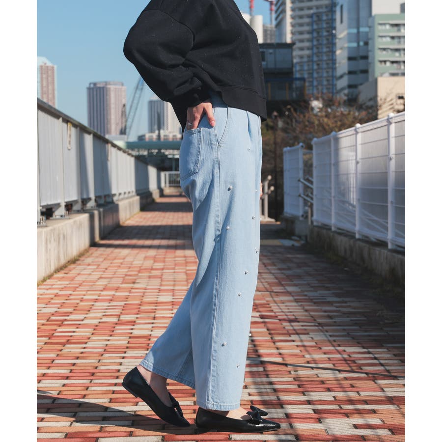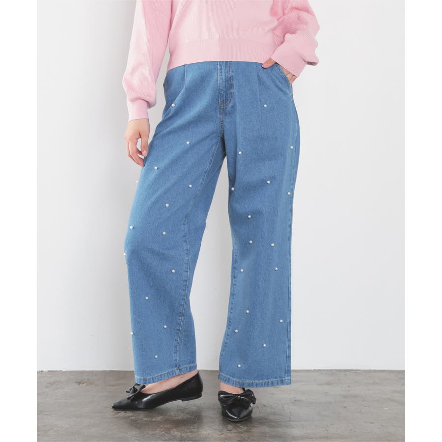 広がりすぎないワイドデニムのフロントにパールビーズをちりばめたトレンドライクなデザイン。