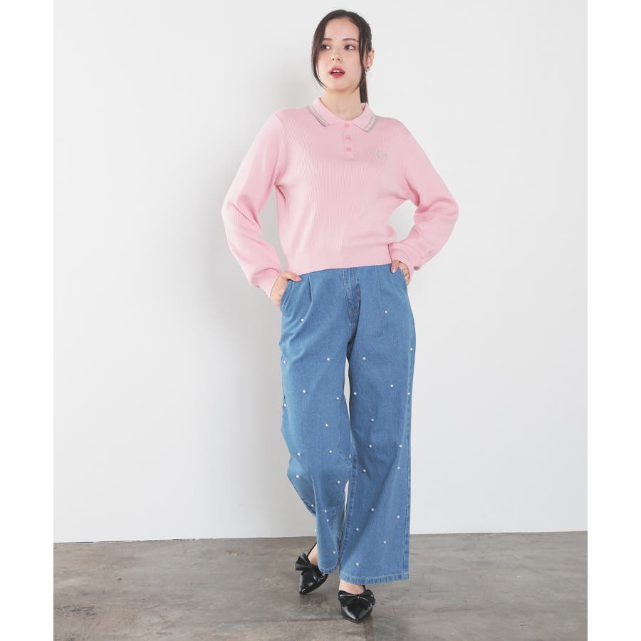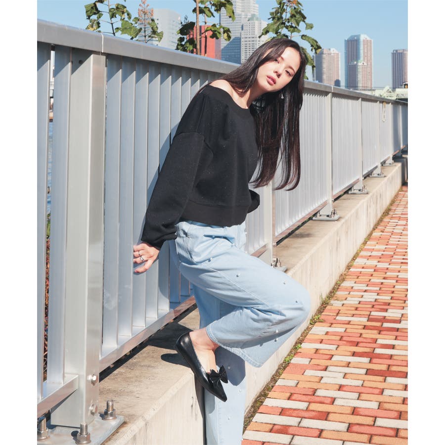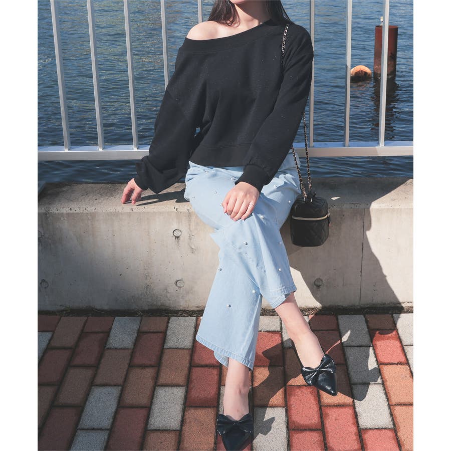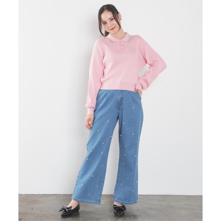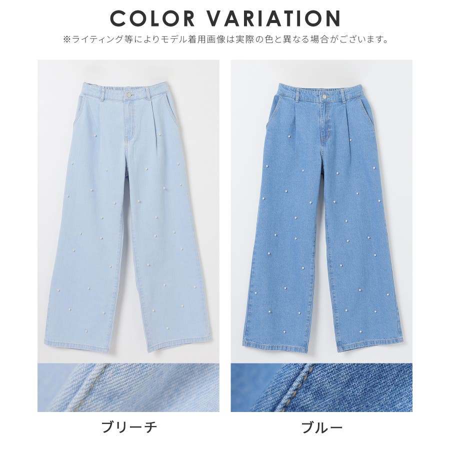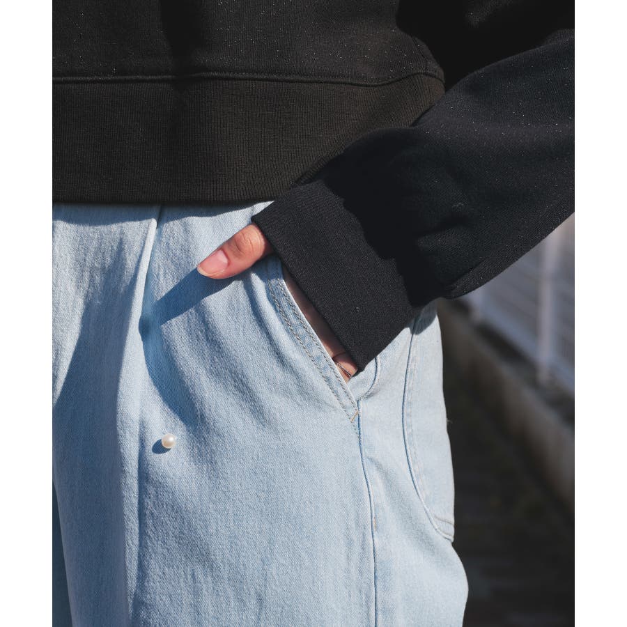 広がりすぎないワイドデニムのフロントにパールビーズをちりばめたトレンドライクなデザイン。