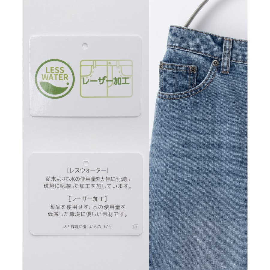 水の使用量を削減し、レーザーによるダメージ加工で薬品を使用せず、環境に配慮して作られた、柔らかめで洗濯後も乾きやすい綿混デニム素材。