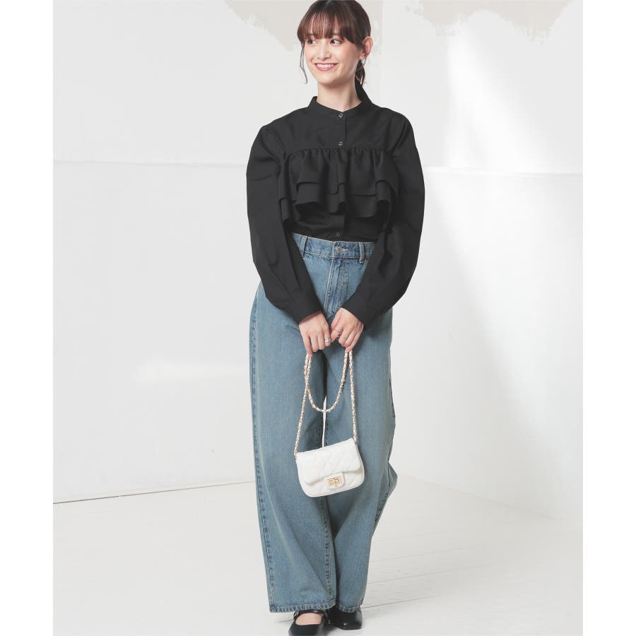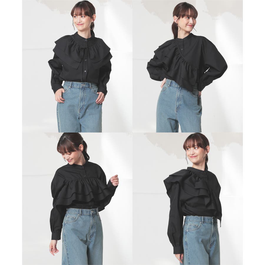 フリル単品で秋冬はニットやスウェット、春夏はTシャツやお手持ちのブラウスなどにも使え、さまざまな着こなしに大活躍。