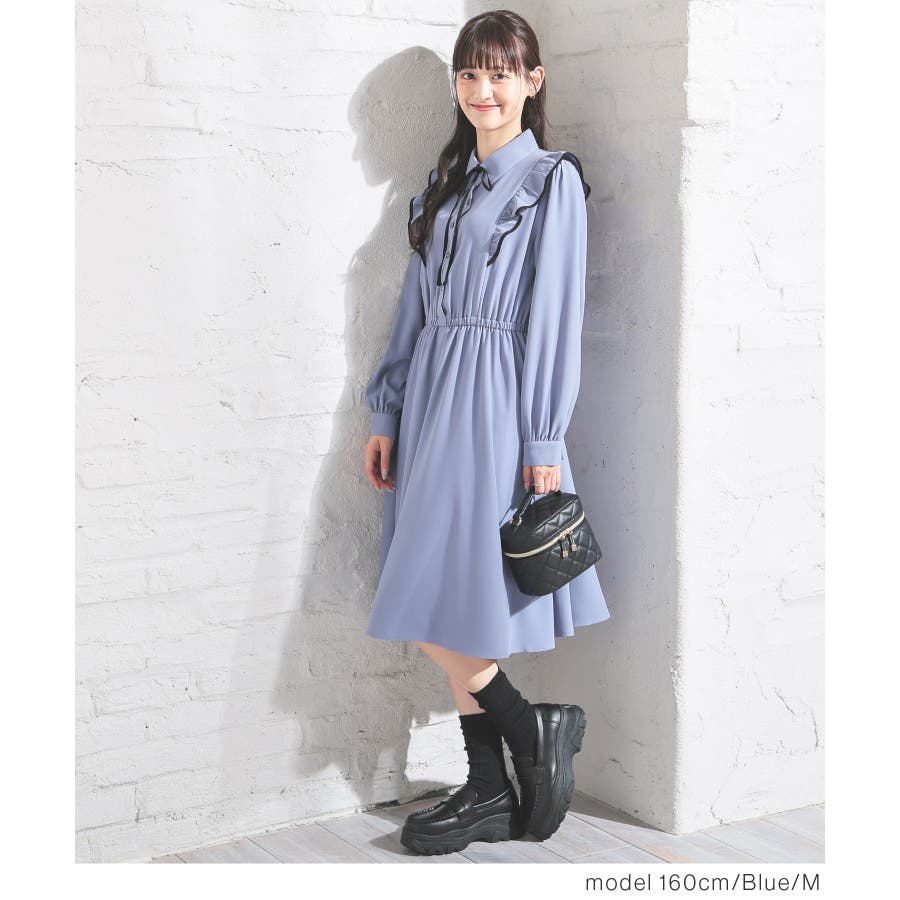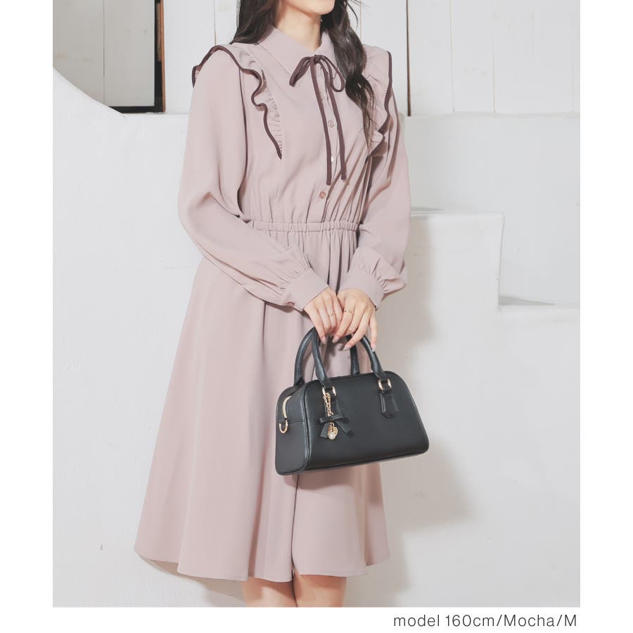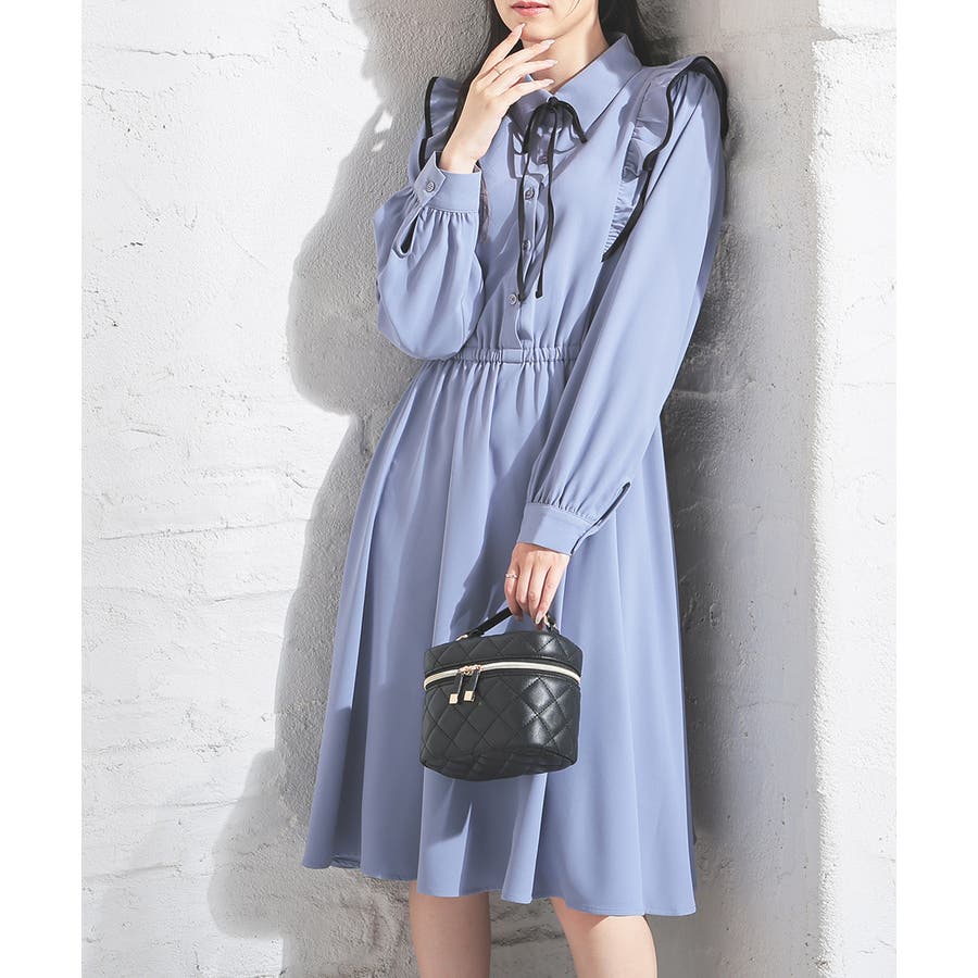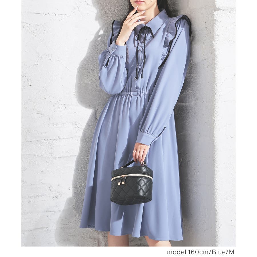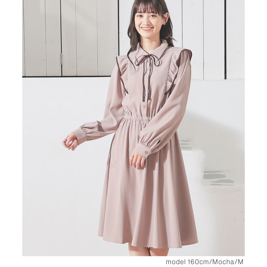 縦に流れる肩フリルと衿元のリボンが華やかなデザイン。