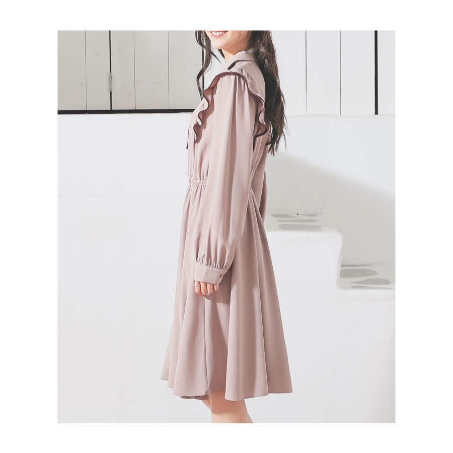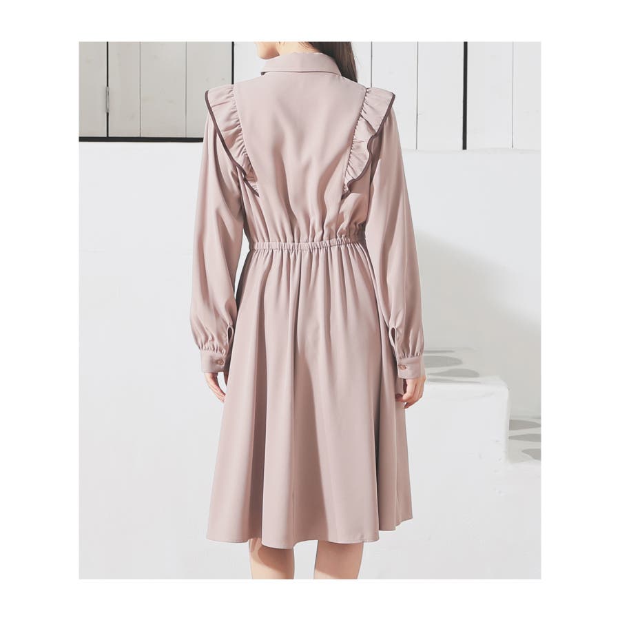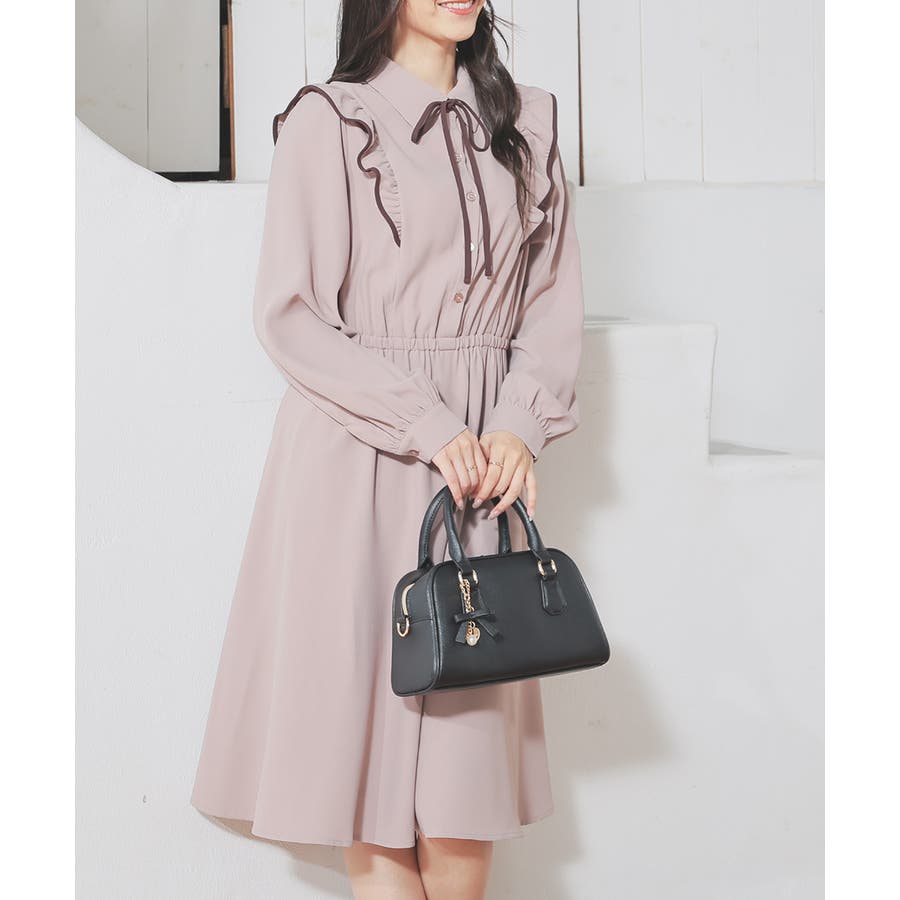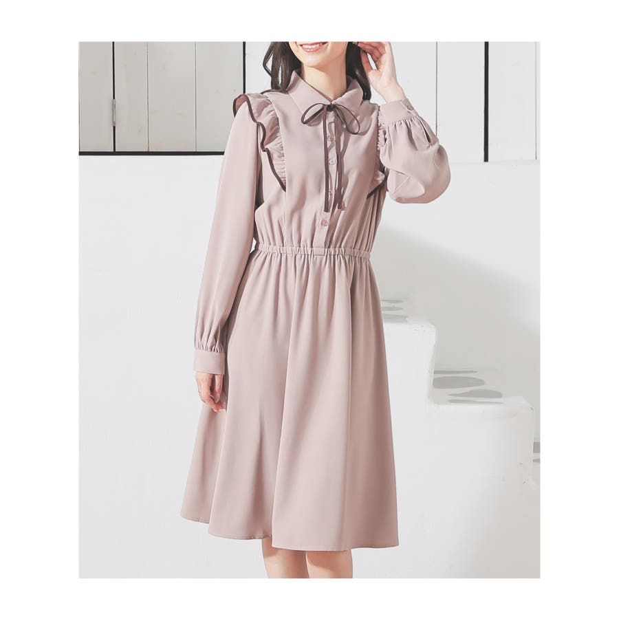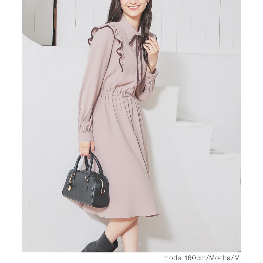 縦に流れる肩フリルと衿元のリボンが華やかなデザイン。