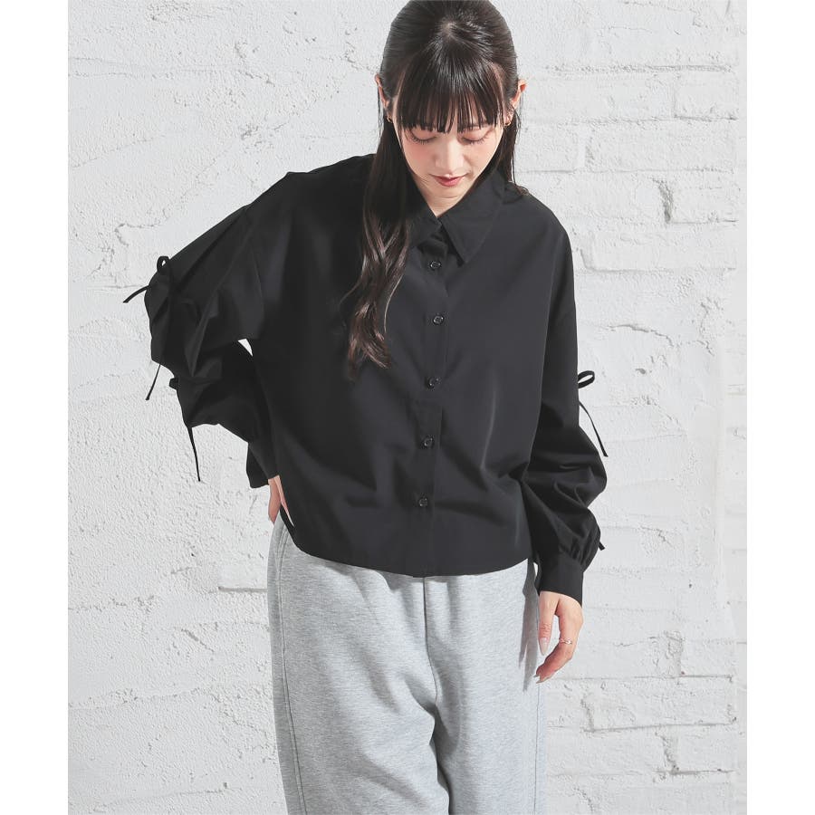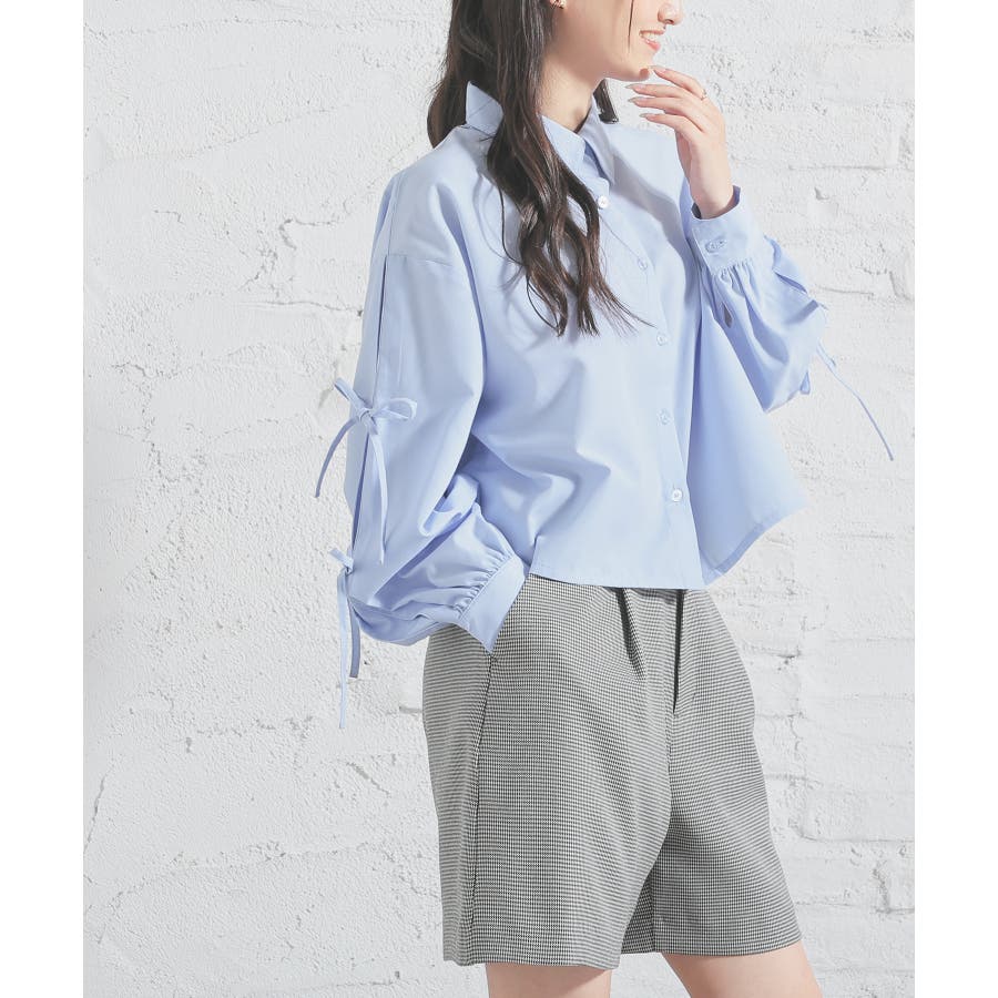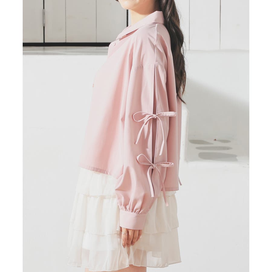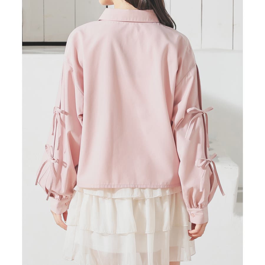 シンプルなレギュラーカラーに袖のリボンがキュートなデザイン。