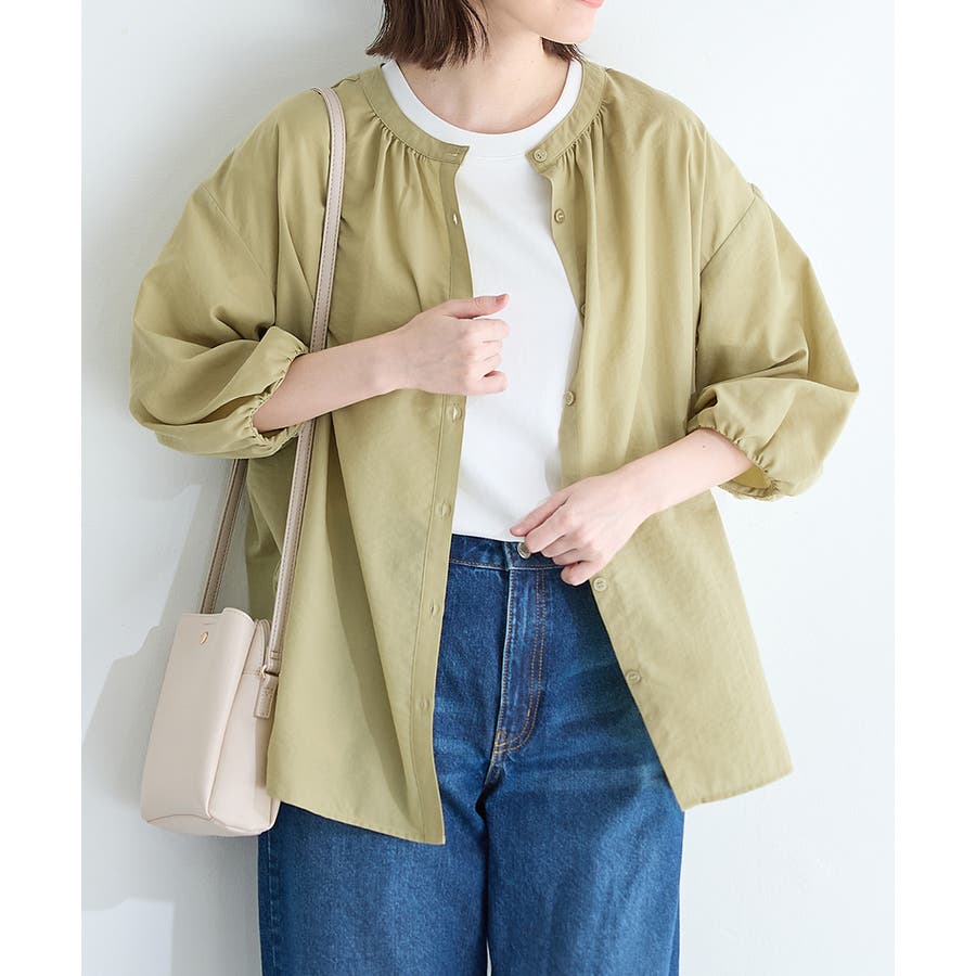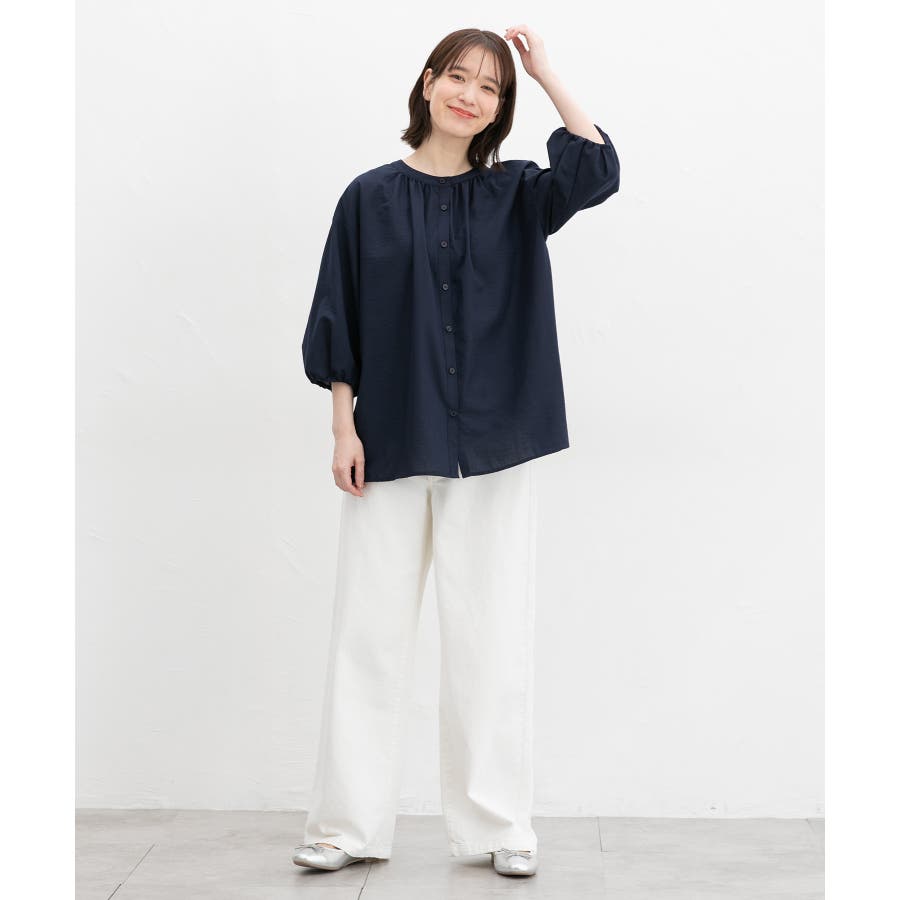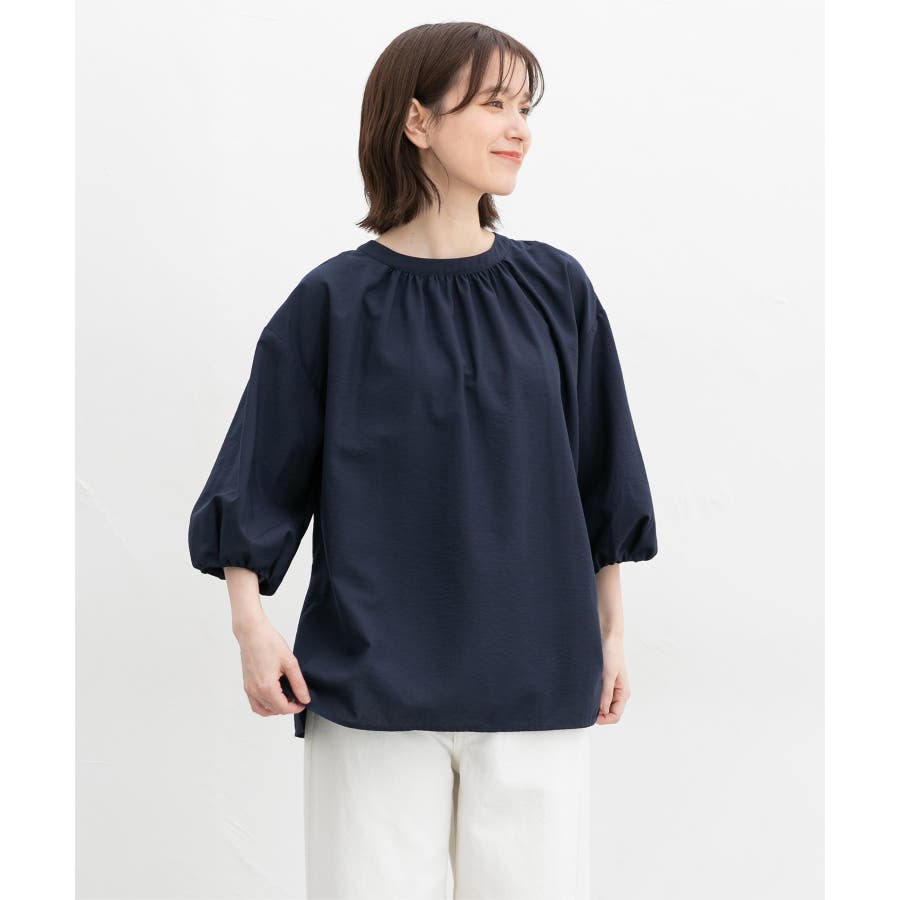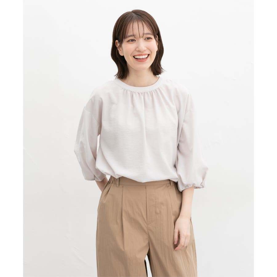細やかなギャザーとふんわり袖で大人可愛い印象に。