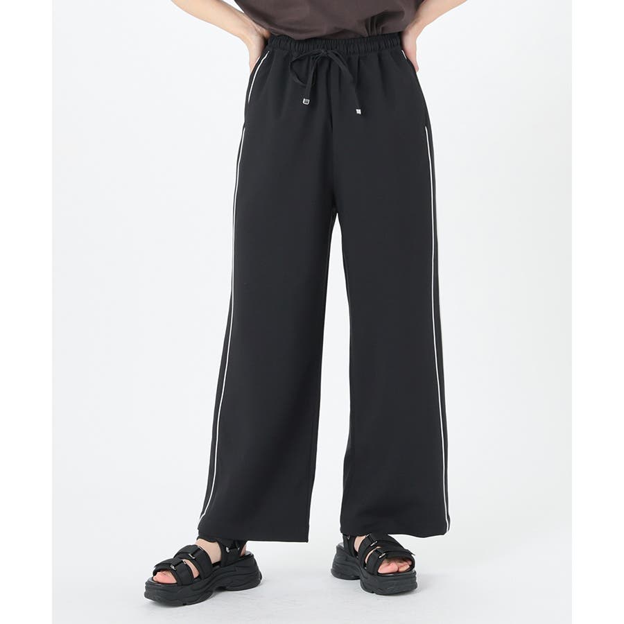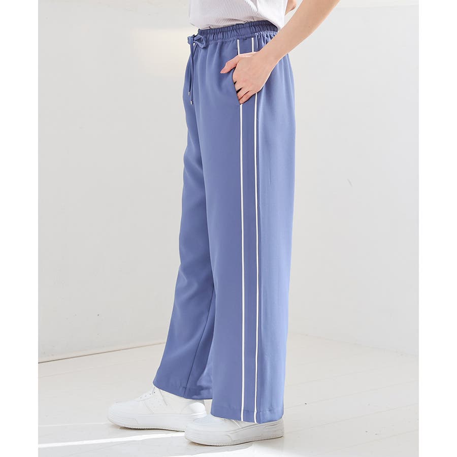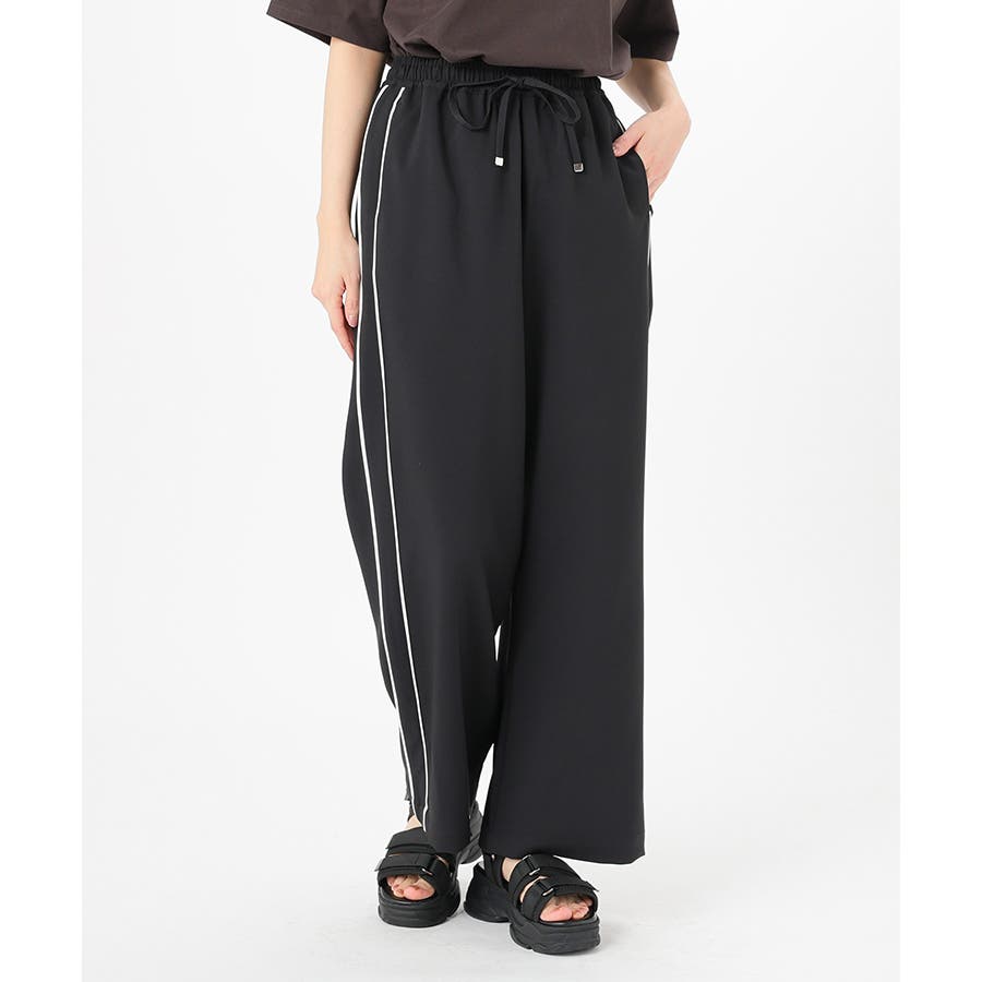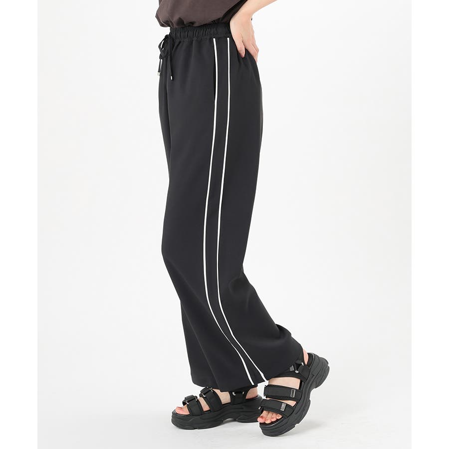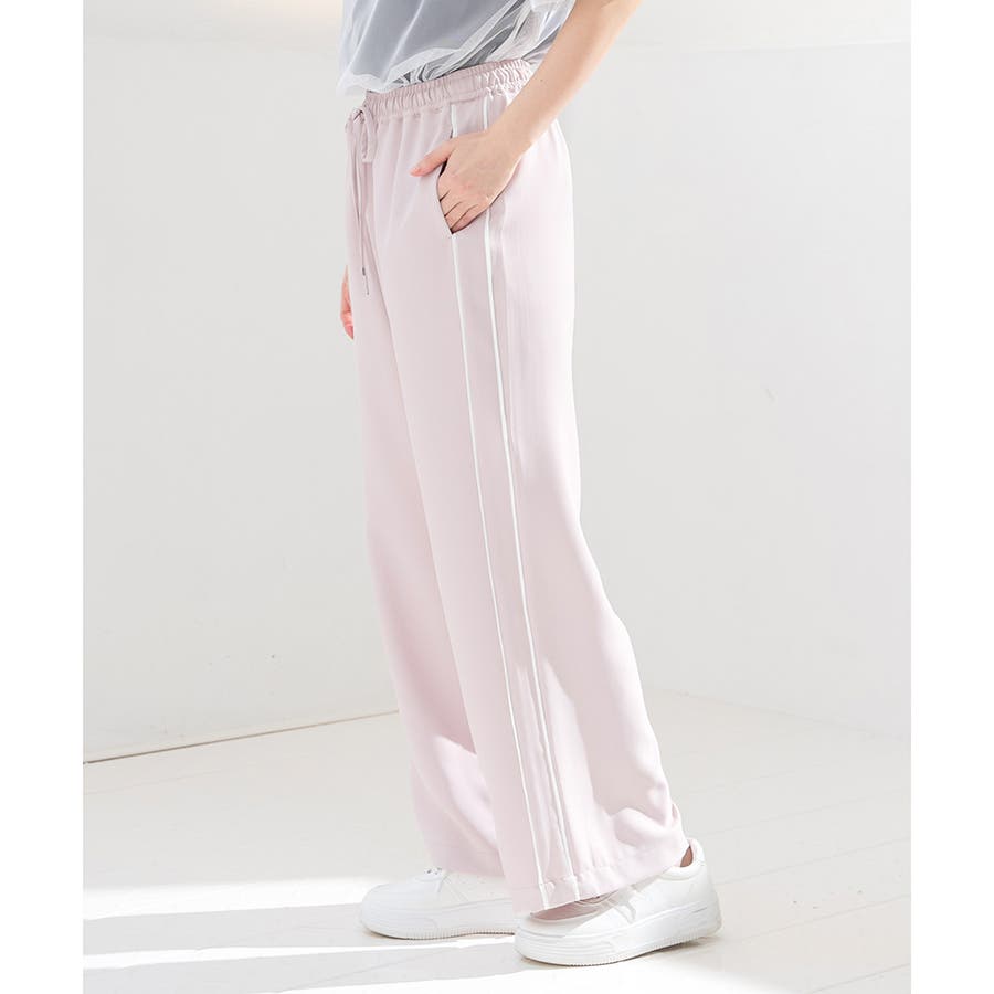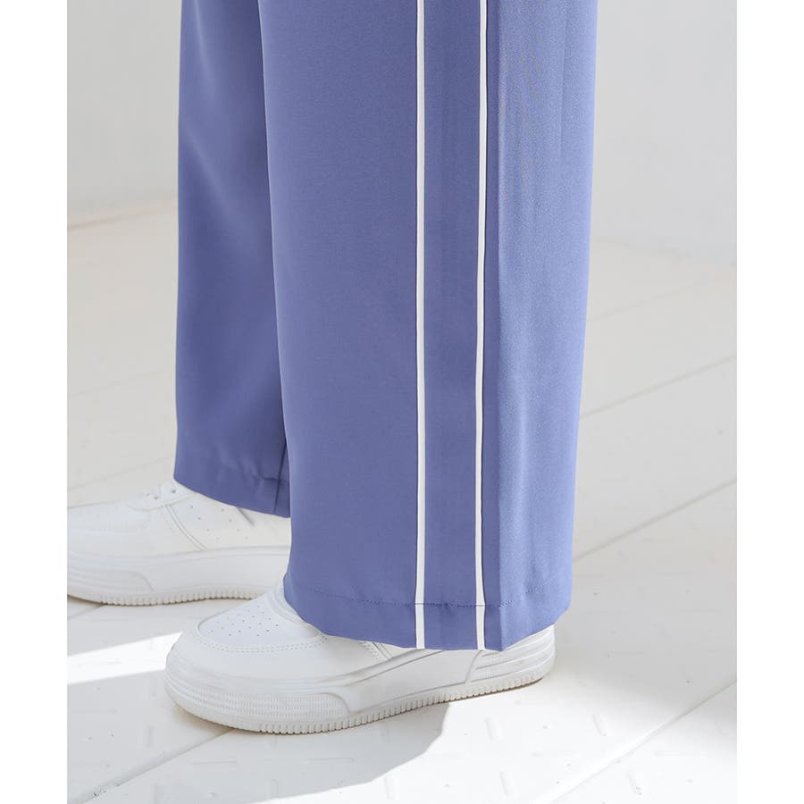 サイドのラインとハイウエストのワイドシルエットで脚長効果も期待できる、今年らしいデザイン。