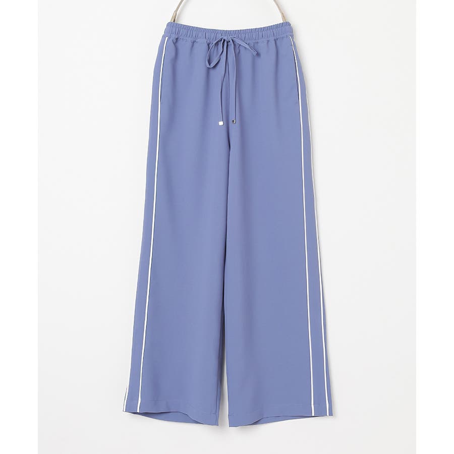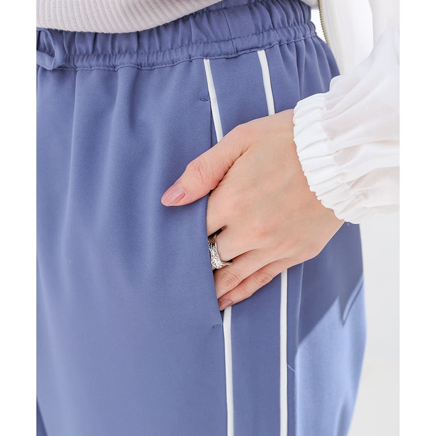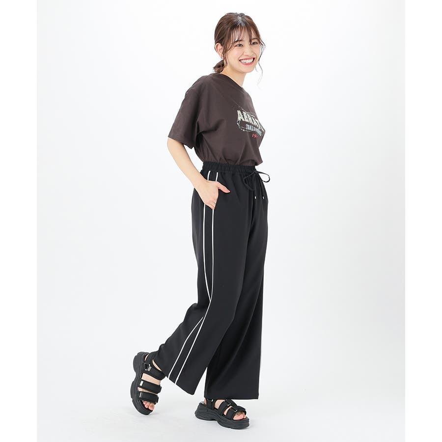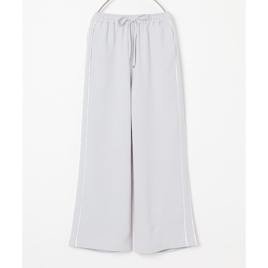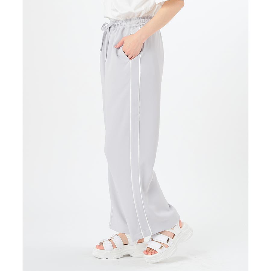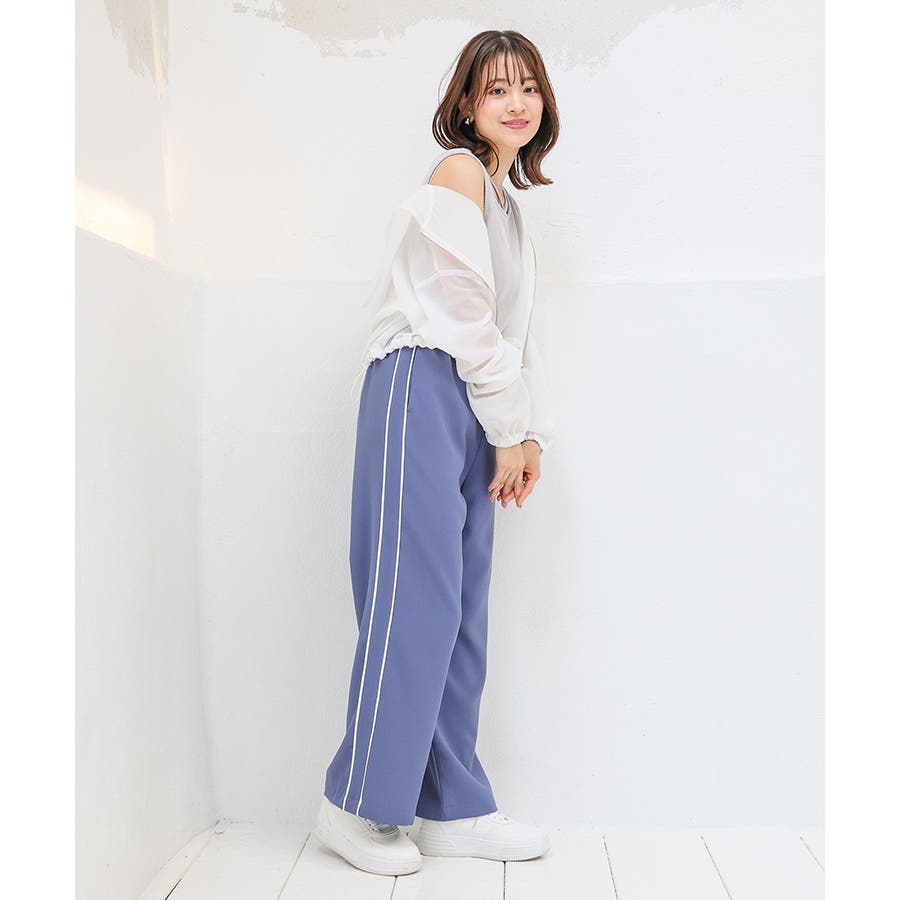 サイドのラインとハイウエストのワイドシルエットで脚長効果も期待できる、今年らしいデザイン。