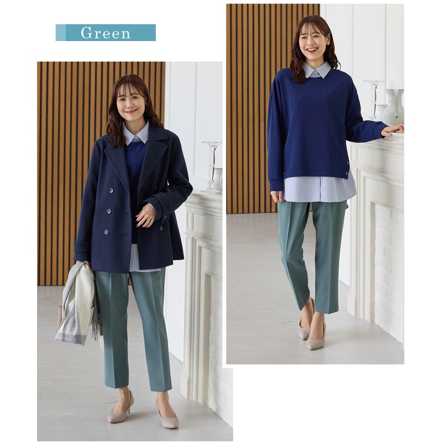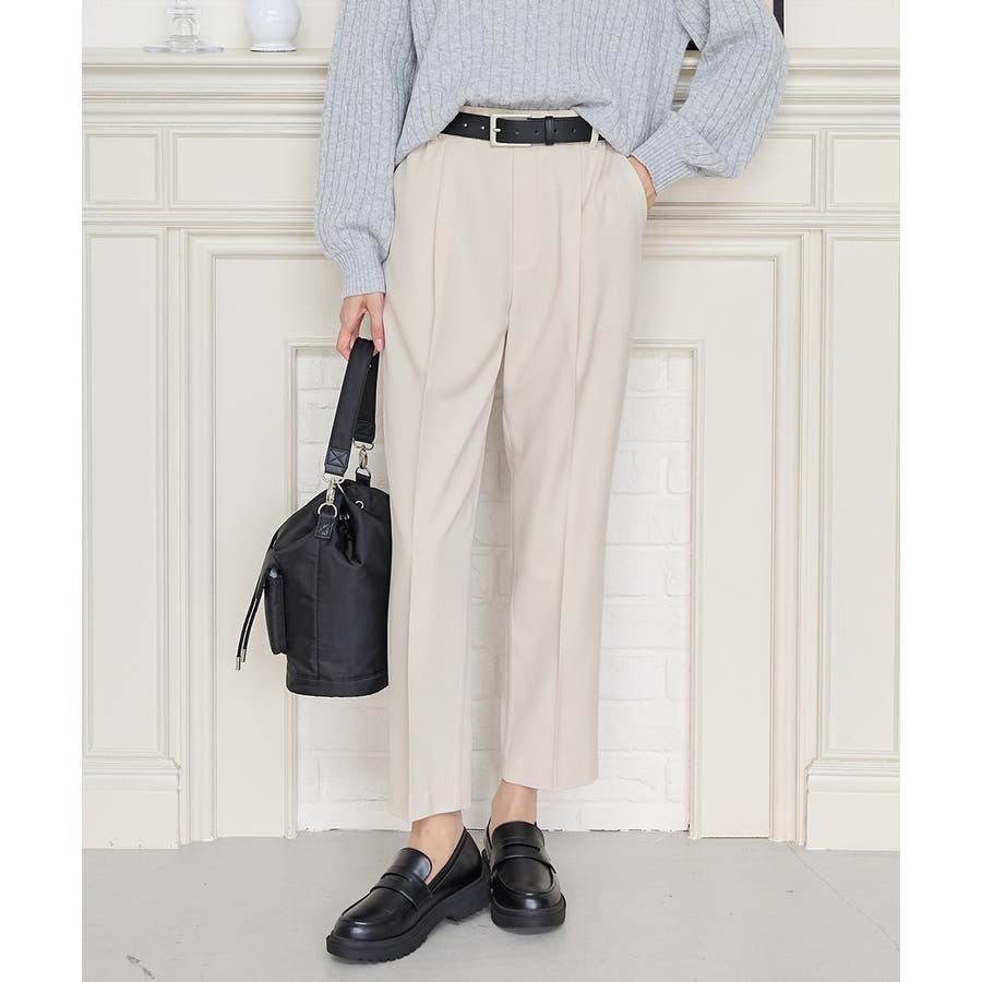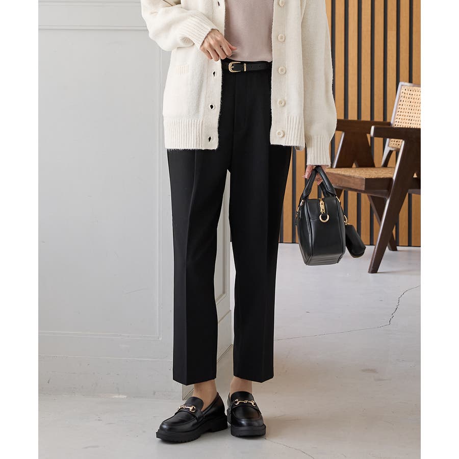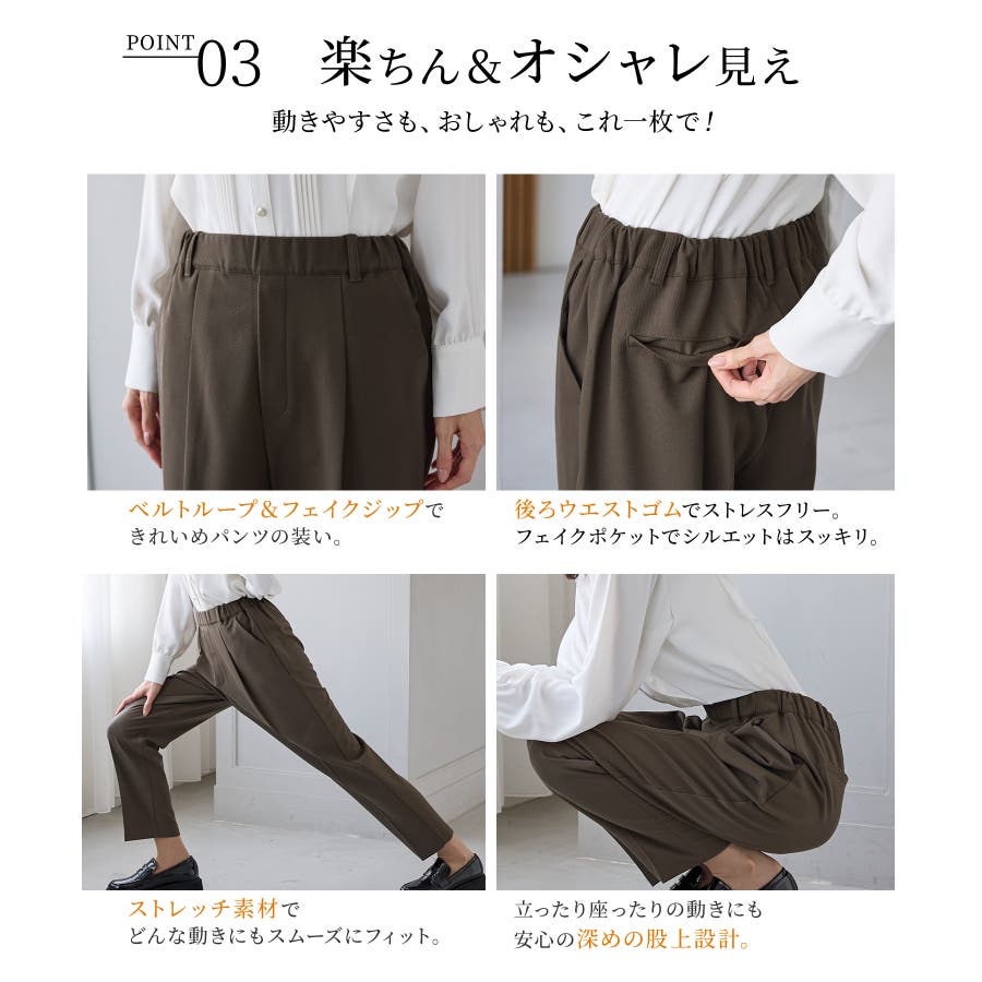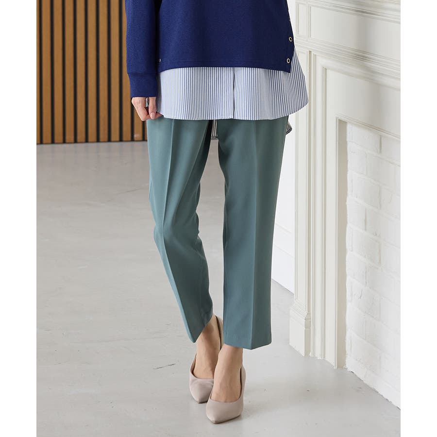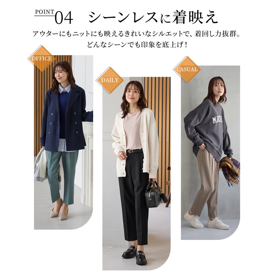 バックのフェイクポケットでヒップを高く見せ、きちんと感のあるセンタープレスと、腰回りのラインにこだわった、裾に向かって細くなる美しいシルエットで美脚効果も抜群。